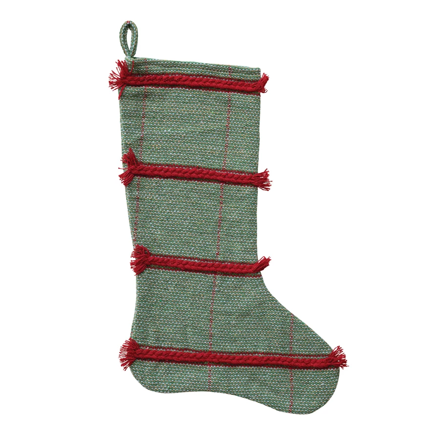 Catalog Name: 20"H Woven Recycled Blend Stocking w/ Braided Embroidery, Grid Pattern & Fringe, Green & Red