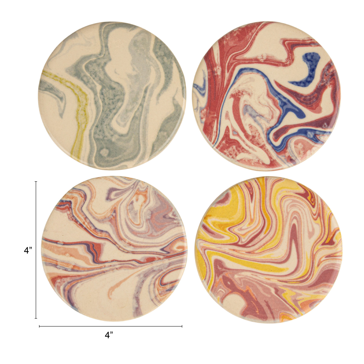 Catalog Name: 4" Round Stoneware Printed Coasters, Marbled Multi Color, Set of 4 Tied w/ Jute