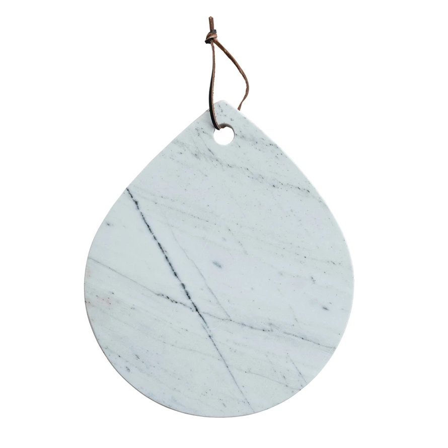 Catalog Name: 14"L x 12"W Marble Cheese/Serving Board w/ Handle & Leather Tie, White Melange (Each One Will Vary)