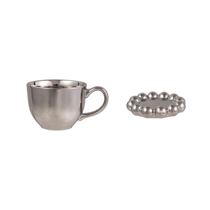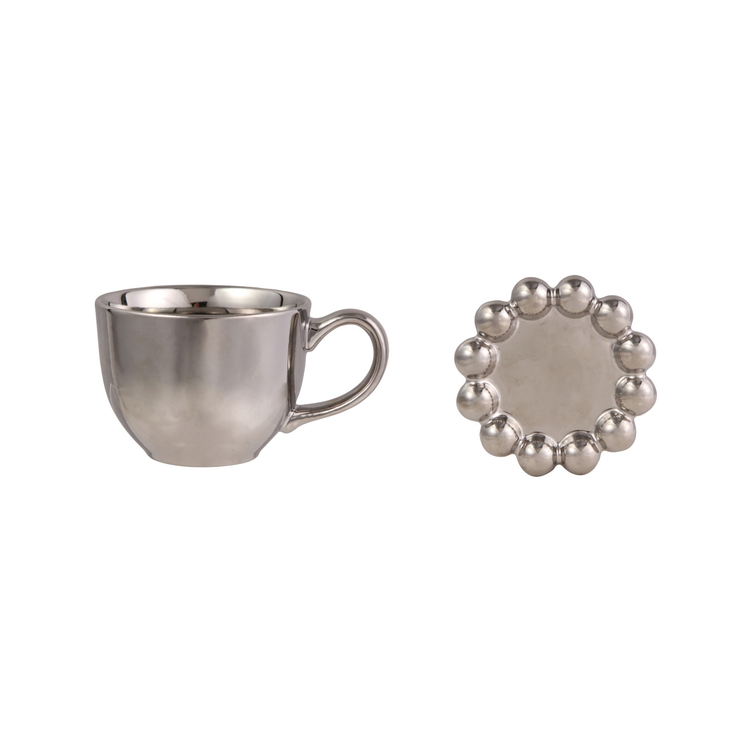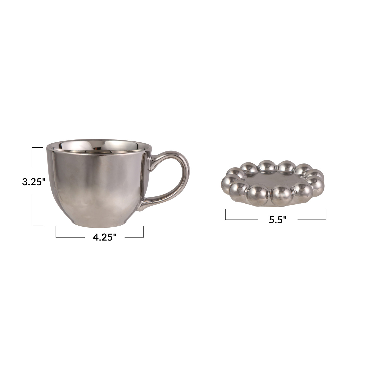 12 oz. Stoneware Mug w/ 5-1/2" Round Ball Edge Saucer, Chrome Finish, Set of 2
