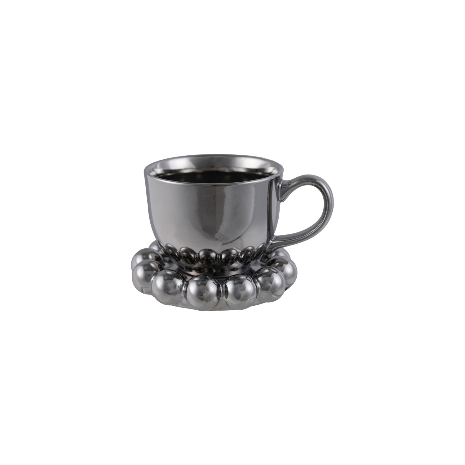 Catalog Name: 4-1/4" Round x 3-1/4"H 12 oz. Stoneware Mug w/ 5-1/2" Round Ball Edge Saucer, Chrome Finish, Set of 2