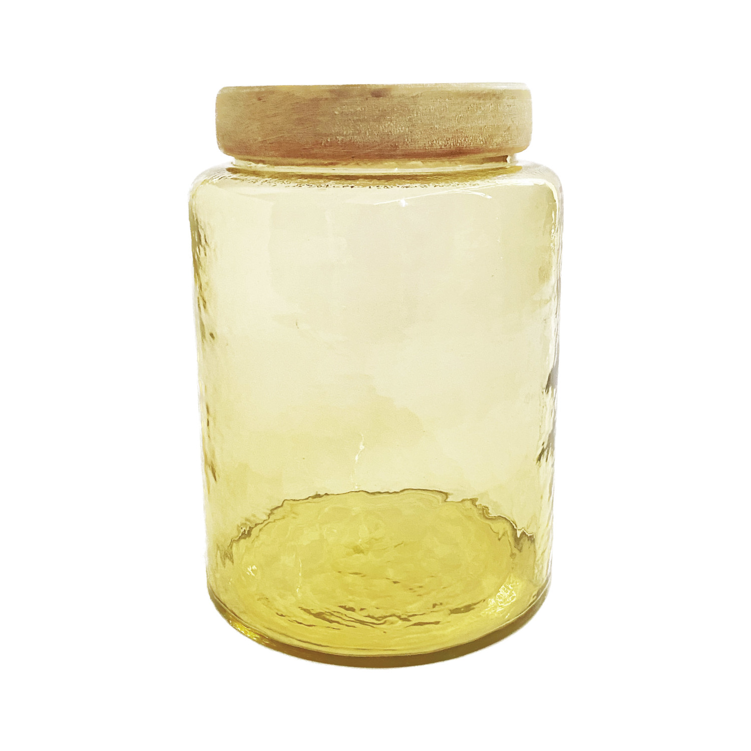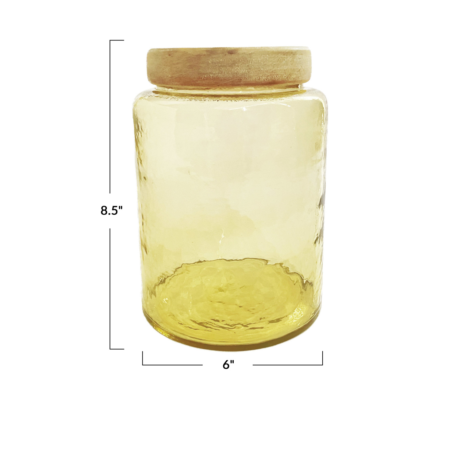 Catalog Name: 6" Round x 8-1/2"H 2-1/2 Quart Hammered Glass Jar w/ Mango Wood Lid, Yellow & Whitewashed