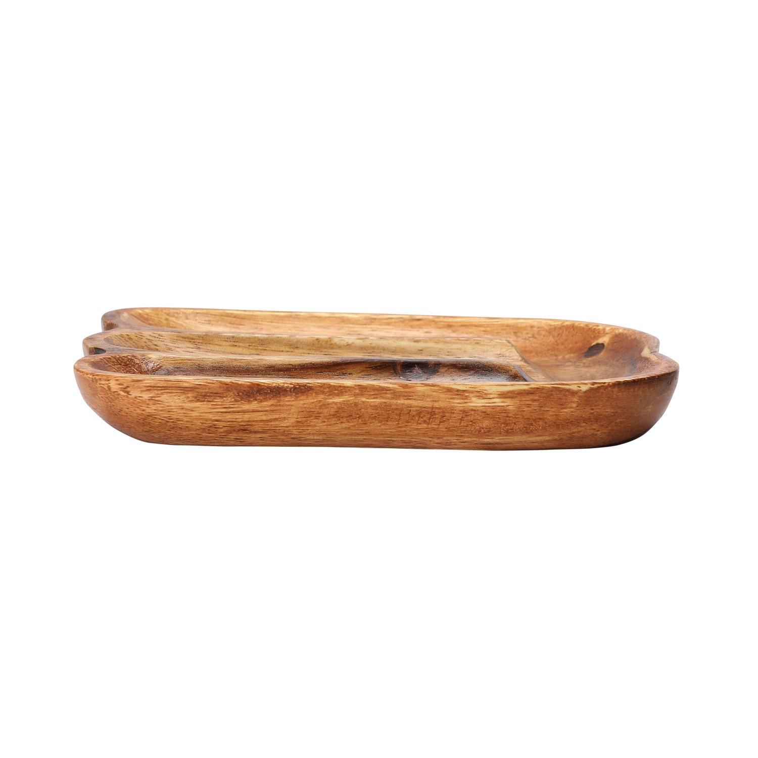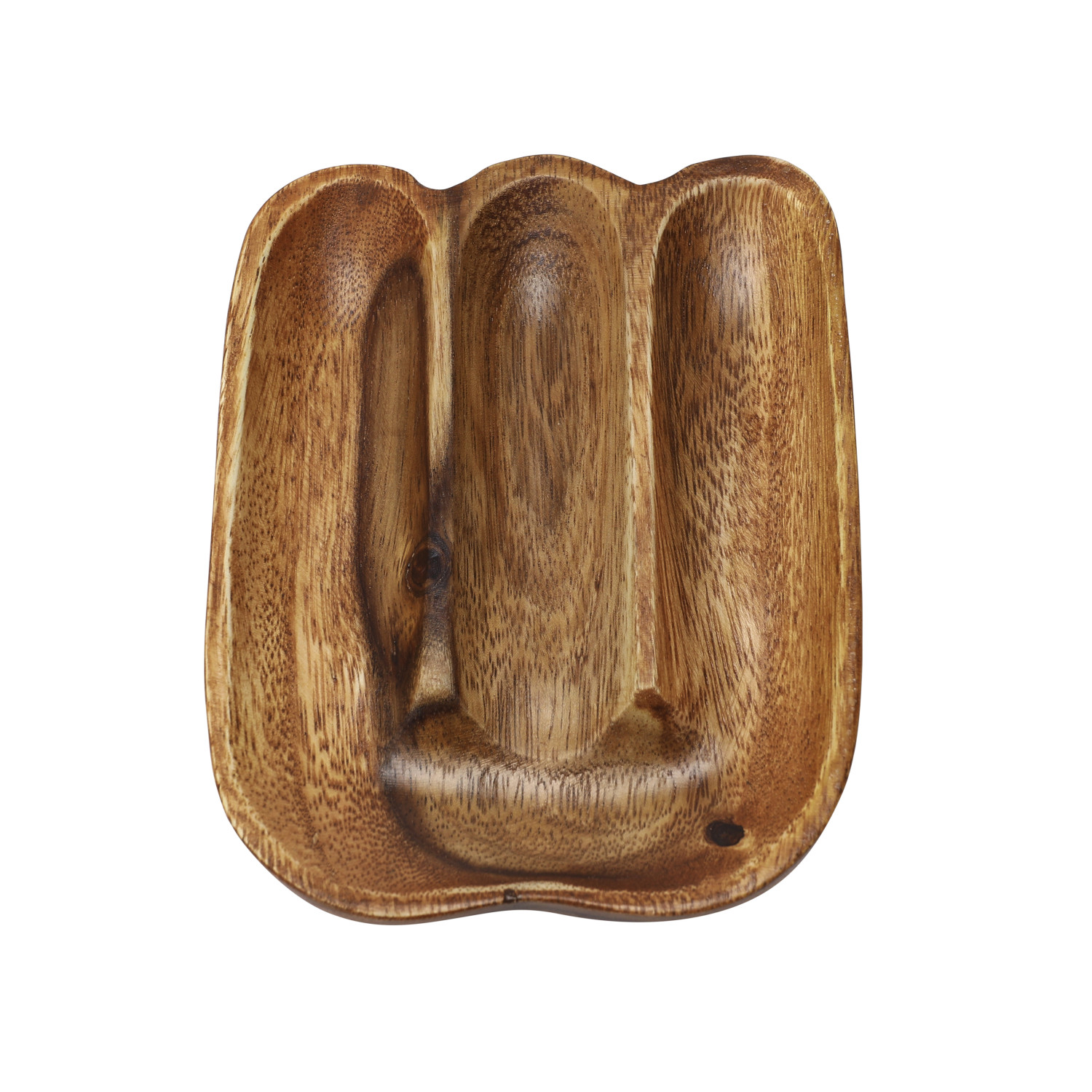 This strikingly modern acacia wood tray showcases 3 intricately carved sections.