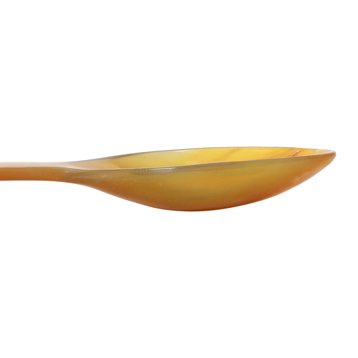 This striking serving spoon showcases intricately carved horn with a 2-tone finish in a printed drawstring bag.