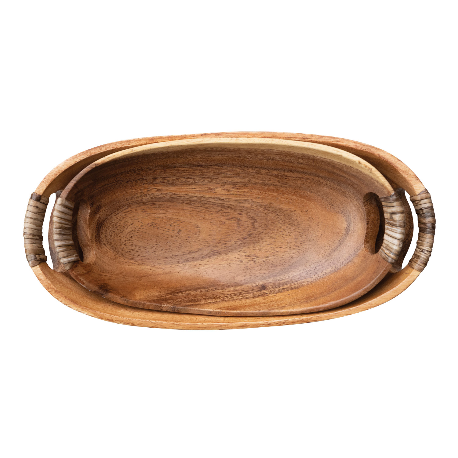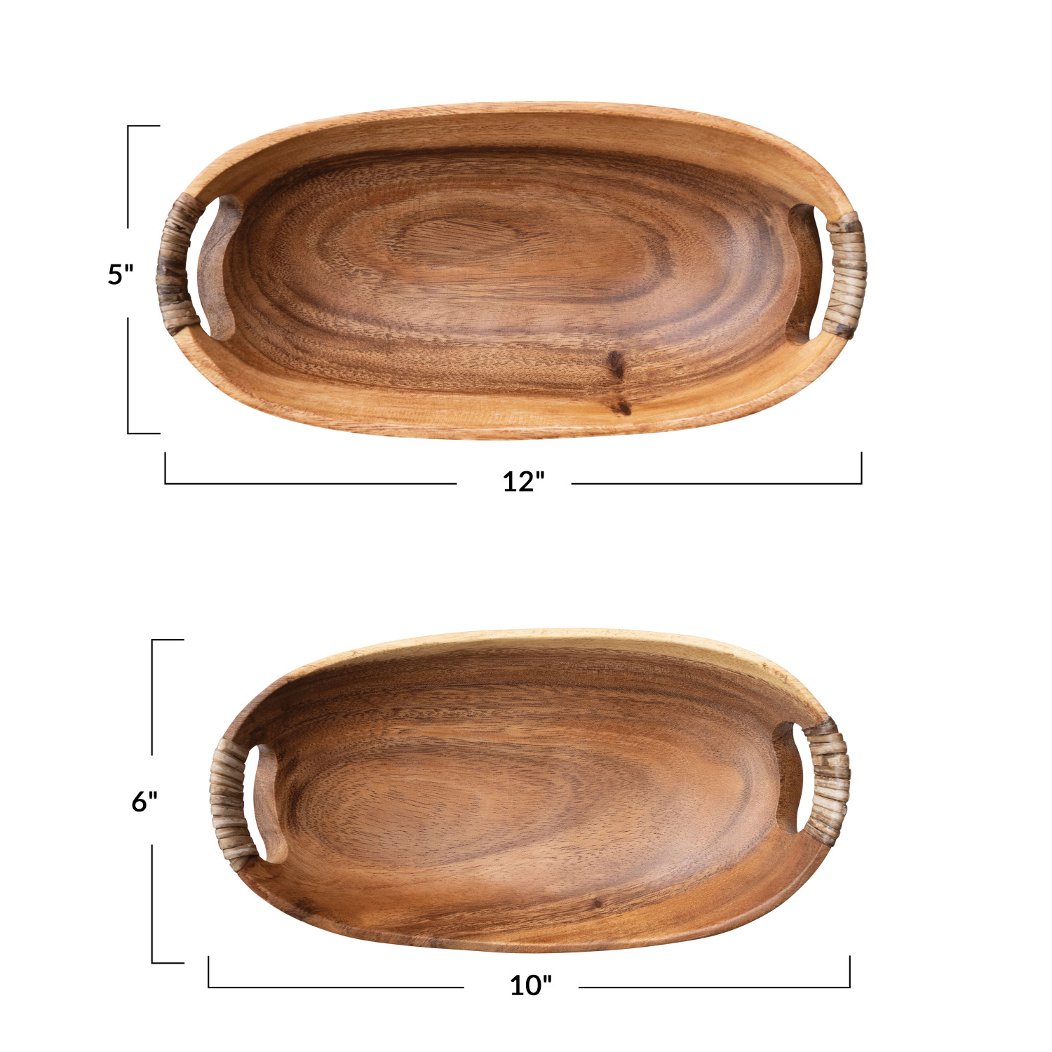 Catalog Name: 12"L x 6"W x 3"H & 10"L x 5"W x 2"H Acacia Wood Bowls w/ Rattan Wrapped Handles, Natural, Set of 2