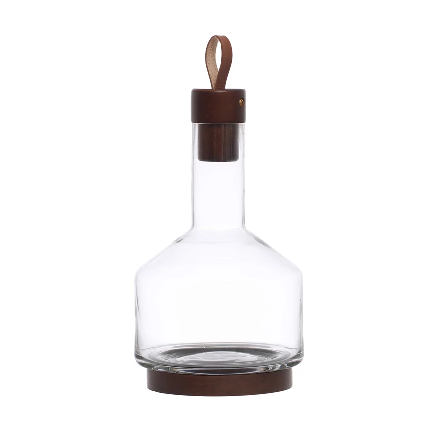 62 oz. Glass Carafe w/ Acacia Wood Base, Stopper & Leather Pull, Walnut Finish