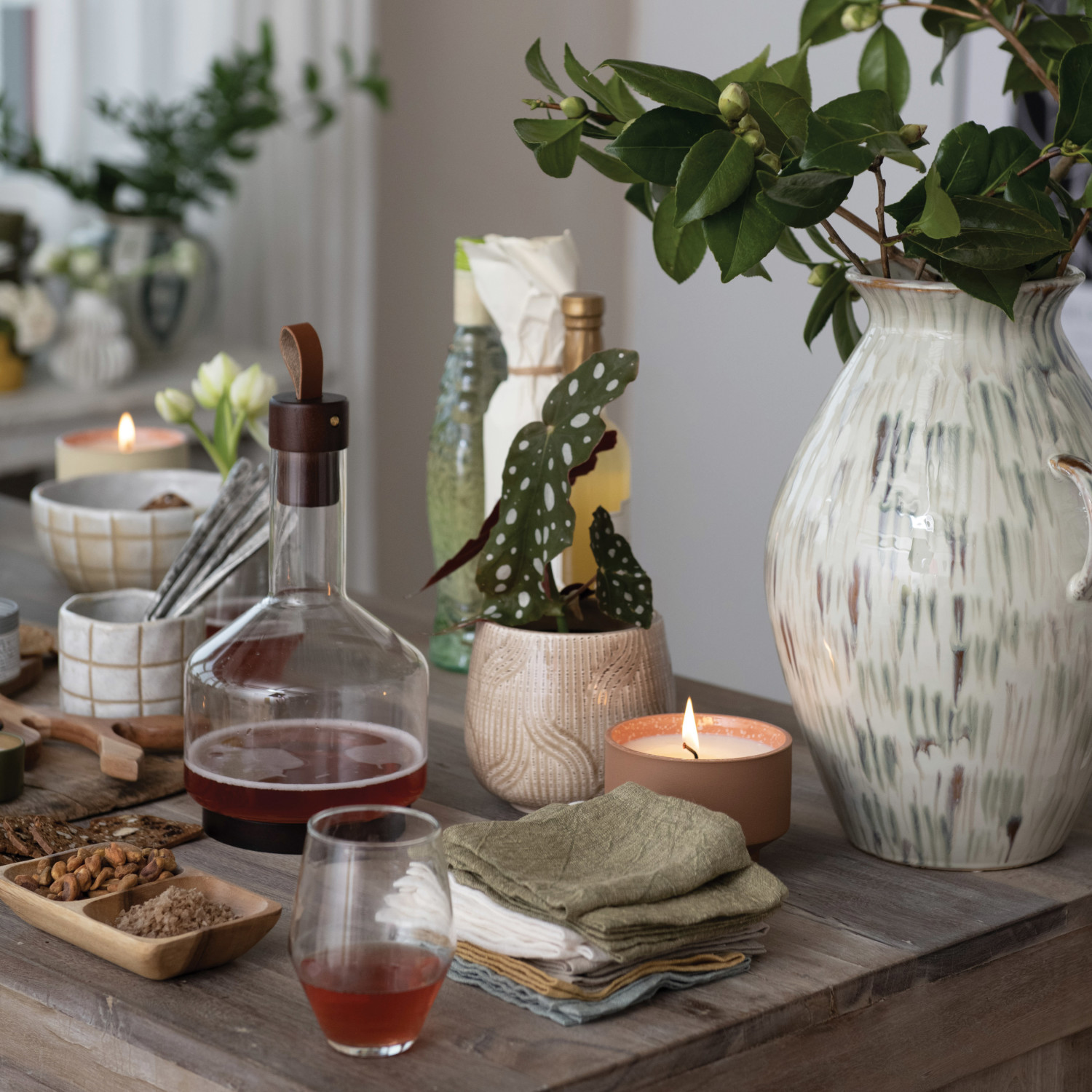 These collections of serving pieces are a must-have for every kitchen for those who love to cook and serve delicious food. They can find the ideal dishes for every table in classic white, vibrant colors, or modern patterns. The serving pieces come in various shapes, sizes, and materials, such as ceramic, stoneware, porcelain, or glass. They can create their unique style by mixing and matching them or choose a matching set for a coordinated look. These serveware are not only picture-worthy, but also durable, microwave-safe, and dishwasher-safe. These collections of serving pieces will make every meal more fun and memorable, whether they are hosting a dinner party, a family gathering, or a casual brunch. This exquisite glass carafe with a walnut-finished acacia wood base, stopper, and leather pull is a functional and elegant beverage service accessory. The sleek glass body, complemented by the warm tones of the acacia wood base and the luxurious leather pull, creates a harmonious blend of textures and colors that suits contemporary, rustic, or eclectic styles. With a generous capacity of 62 ounces, this carafe is perfect for serving and storing a wide range of beverages, such as water, juice, infused drinks, and more. Made of glass and acacia wood.