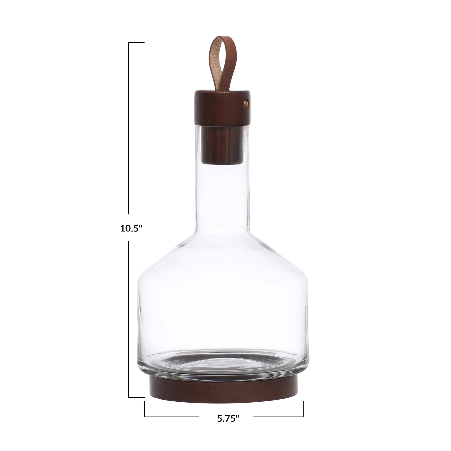 Catalog Name: 5-3/4" Round x 10-1/2"H 62 oz. Glass Carafe w/ Acacia Wood Base, Stopper & Leather Pull, Walnut Finish