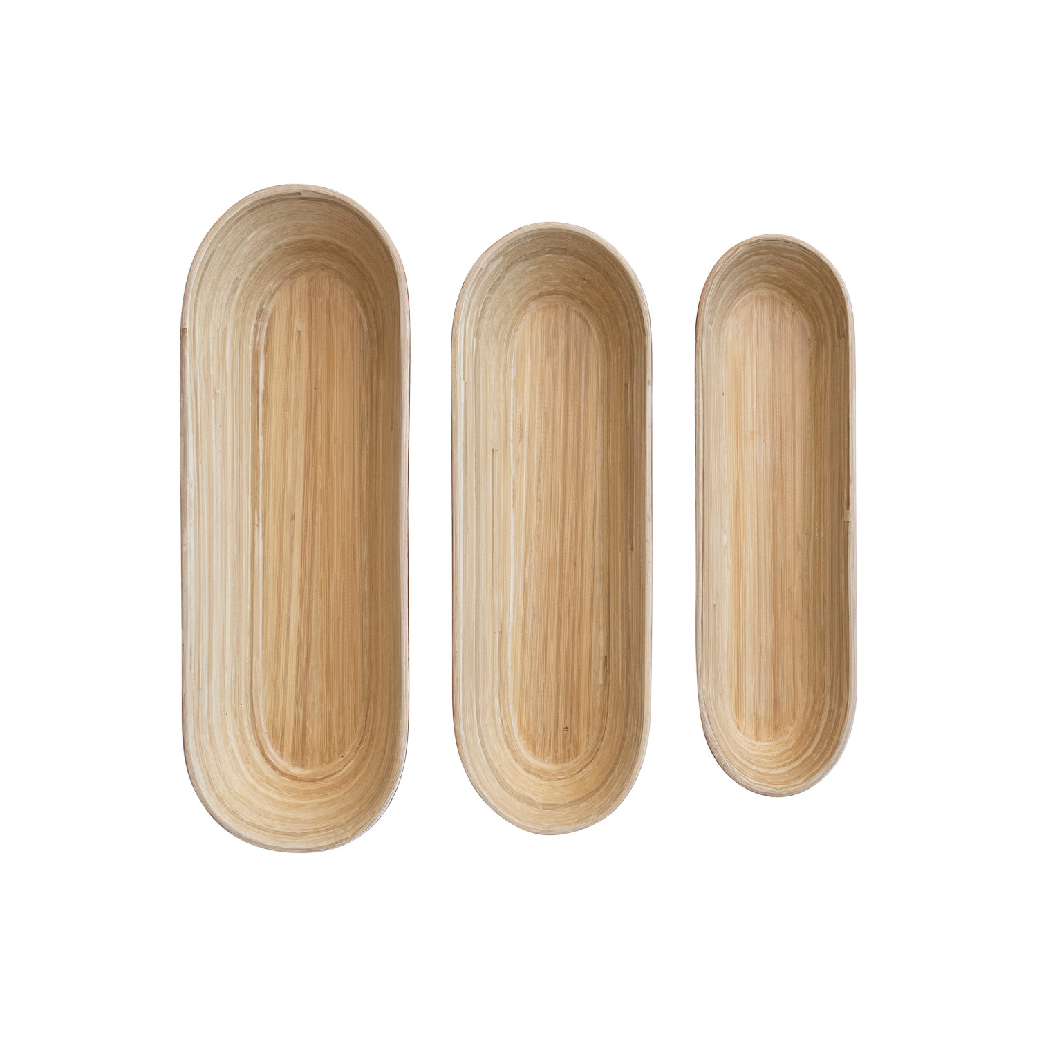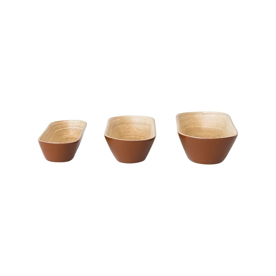 Catalog Name: 16-1/4"L x 6"W x 2-3/4"H, 15"L x 5"W x 2-1/2"H & 14"L x 4"W x 2"H Lacquered Bamboo Bowls, Caramel Brown & Natural, Set of 3