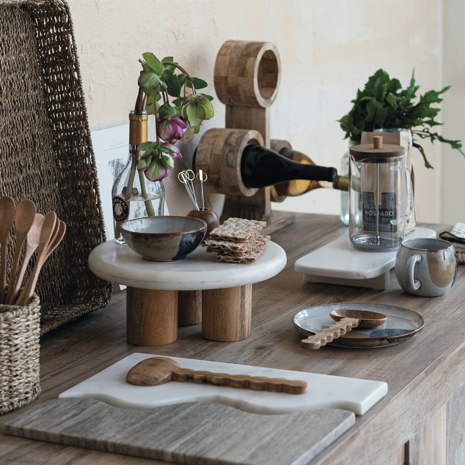 Marble Pedestal w/ Mango Wood Legs, White & Natural, KD