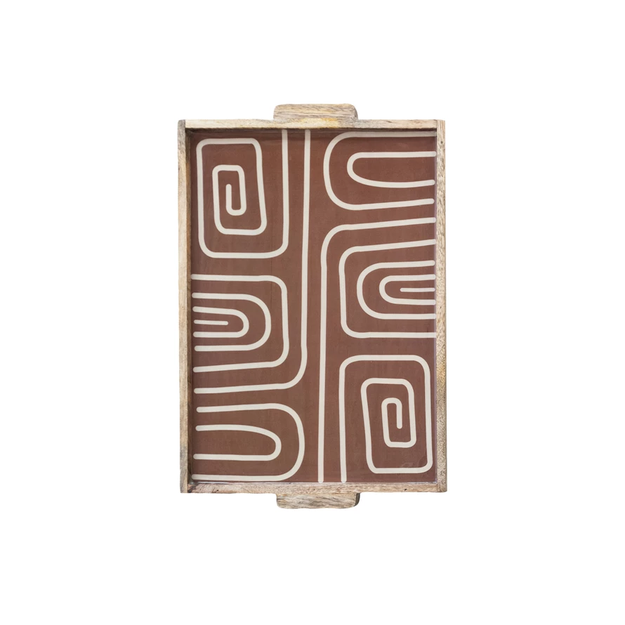 Catalog Name: 15"L x 9-3/4"W Enameled Mango Wood Tray w/ Handles & Design, Caramel, Cream Color & Natural