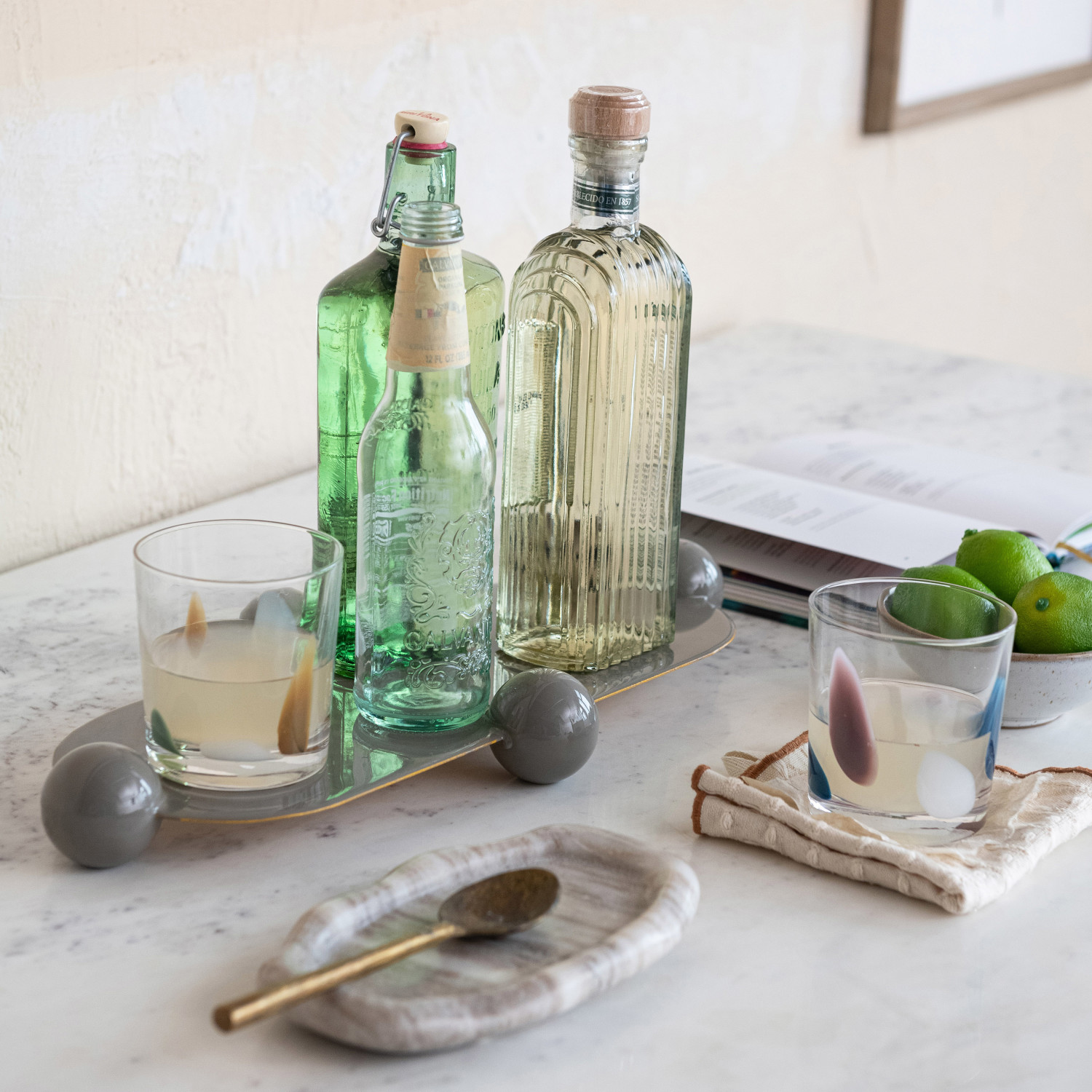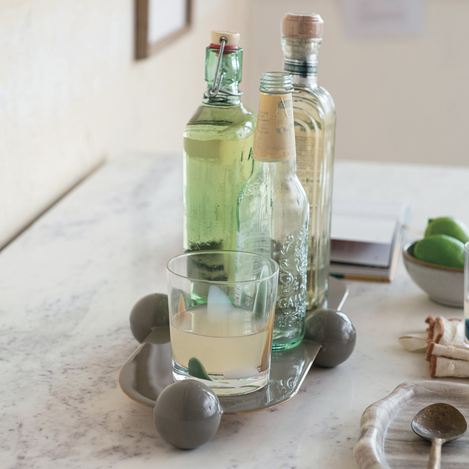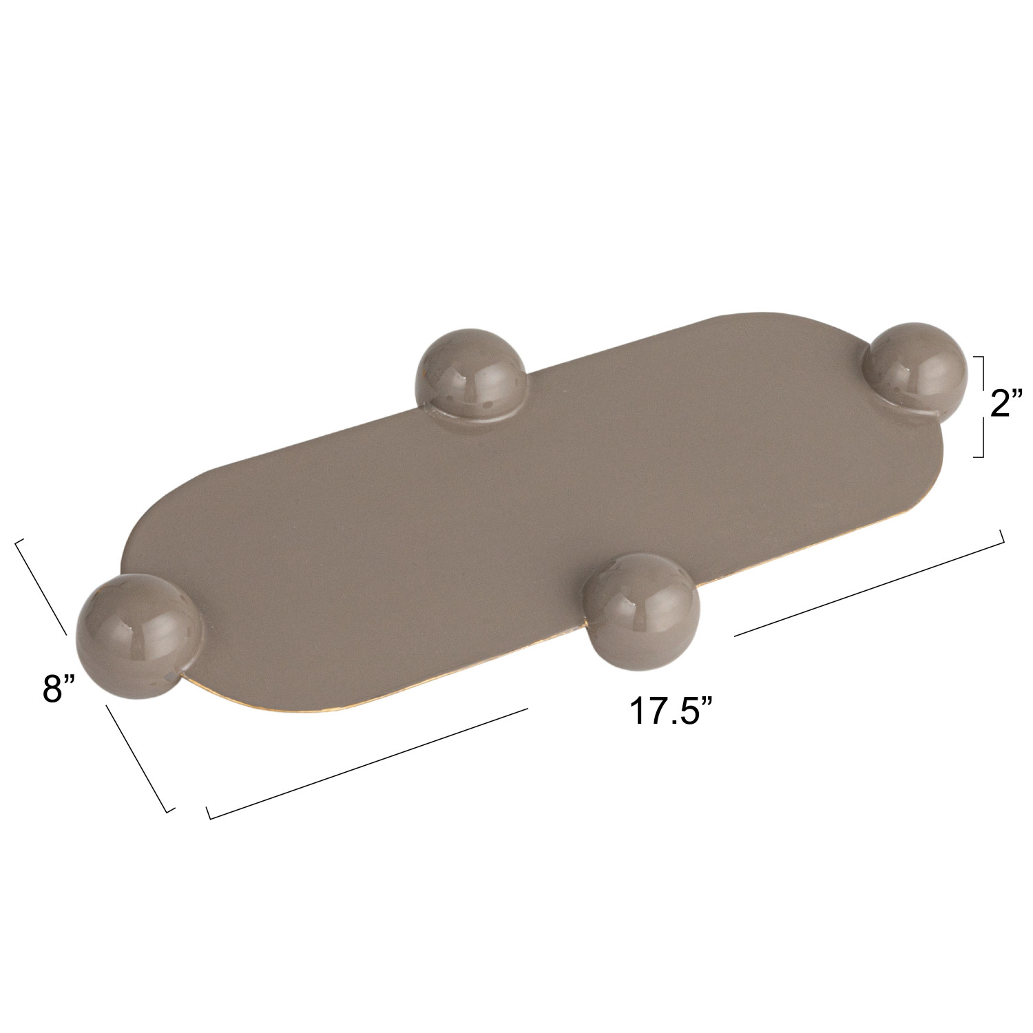 This Elegance Enamel Metal Tray with Ball Feet is the epitome of sophistication. The tray's elongated shape is perfectly complemented by the soft grey enamel, while the gold-finished edges add a hint of opulence. The unique ball feet, each 2 inches in diameter, not only provide stability but also elevate the tray's design, making it a standout piece for any occasion. It measures 17.5 inches in length, 8 inches in width, and 2 inches in height, with 2-inch round balls adding a distinctive touch. Whether used for serving guests or as a permanent fixture on a coffee table, this tray is sure to impress with its blend of functionality and style.