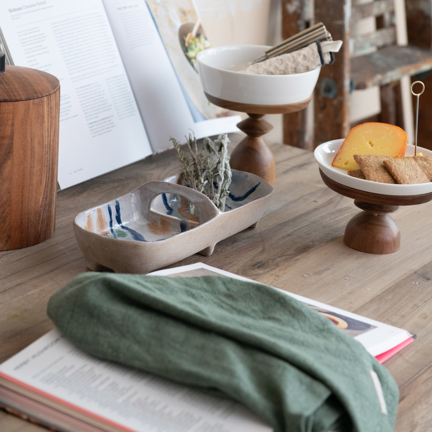 Catalog Name: 11-1/2"L x 5"W x 3"H Stoneware Footed Dish w/ 2 Sections & Handle, Reactive Glaze, Multi Color (Each One Will Vary)