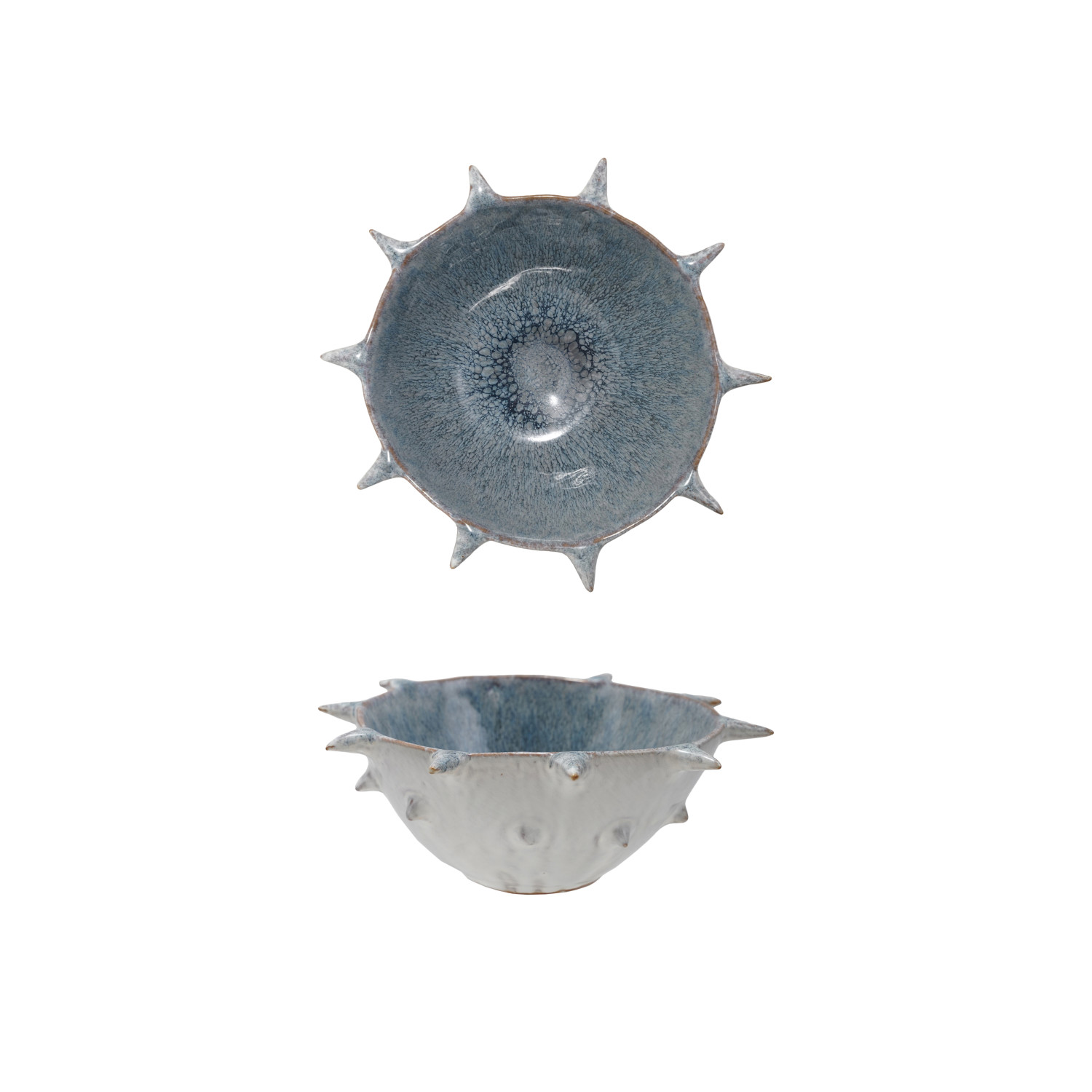 Catalog Name: 9" Round x 3-1/4"H Stoneware Urchin Shaped Bowl w/ Spikes, Reactive Glaze, Blue & White (Each One Will Vary)