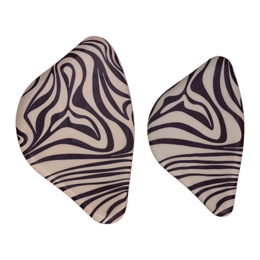 Catalog Name: 12-3/4"L x 8"W & 10-3/4"L x 6-1/2"W Enameled Metal Organic Shaped Trays w/ Striped Design & Gold Edge, Cream & Plum Color, Set of 2