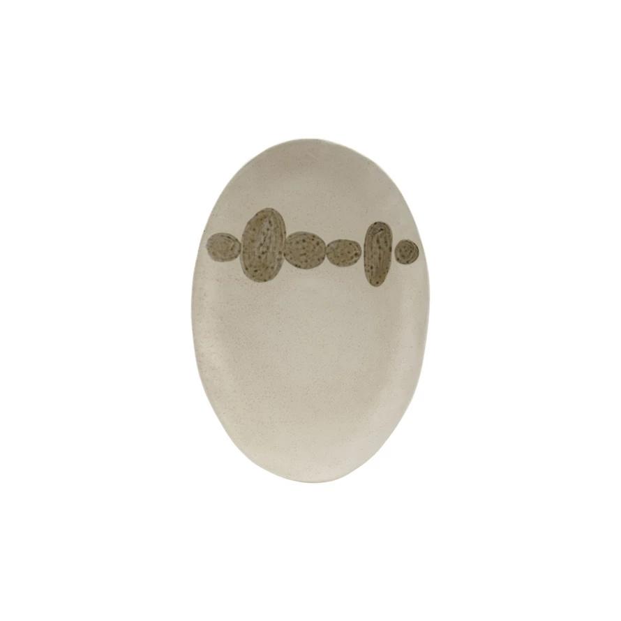 Catalog Name: 14-1/2"L x 10"W Hand-Painted Stoneware Platter w/ Design, Reactive Glaze, Natural & Charcoal Color (Each One Will Vary)