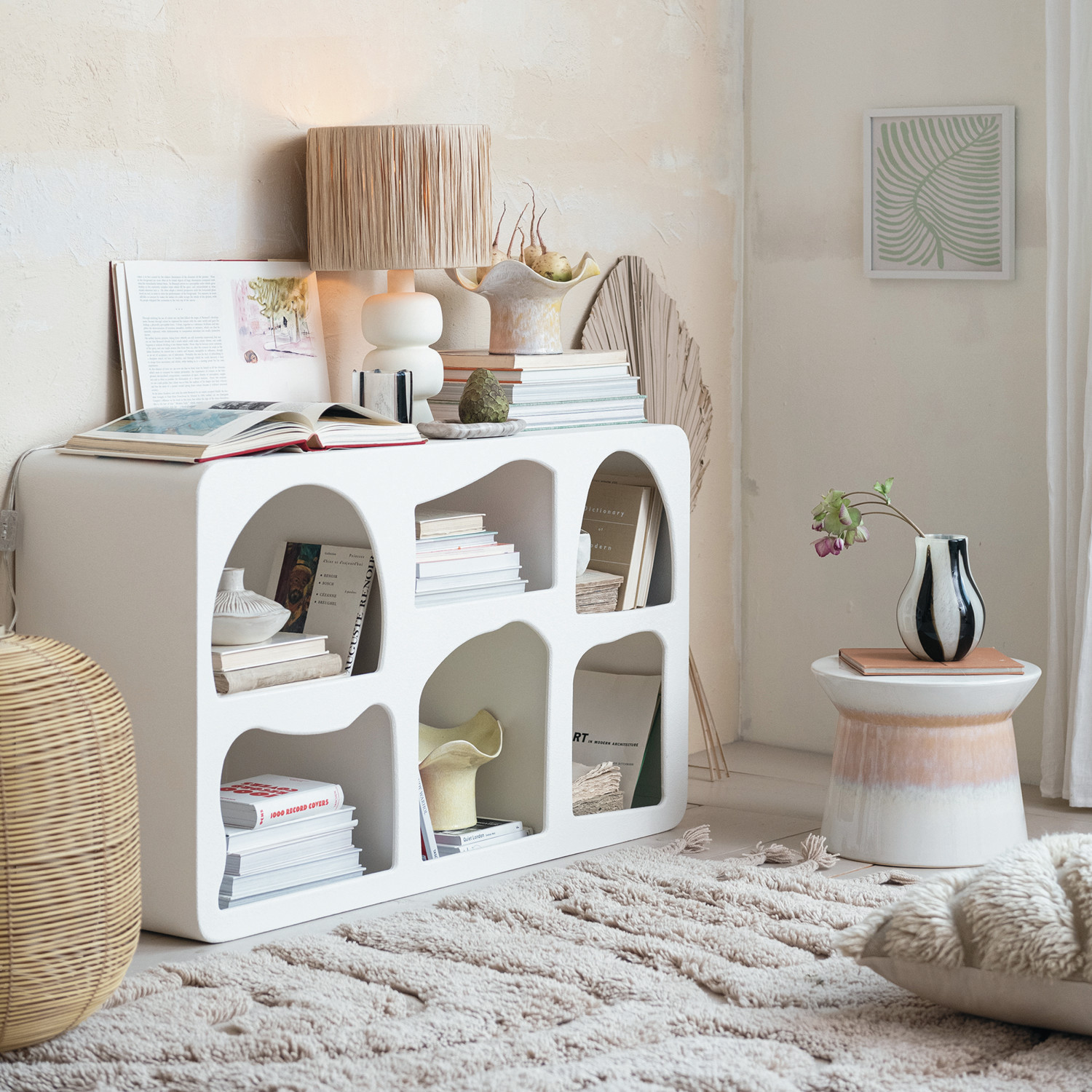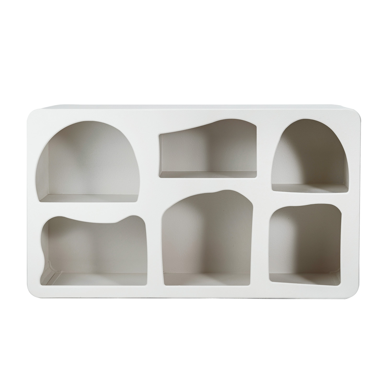 This Versatile Textured White Wood Shelf is a blend of style and practicality. Its six spacious compartments are perfect for displaying books, collectibles, or essentials, while the textured white finish adds a touch of sophistication to the decor. The shelf's dimensions, 46.75 inches long by 15 inches wide by 27.5 inches high, make it an ideal choice for any room, providing significant storage without overwhelming the space. Whether used in a living area, bedroom, or office, this shelf stands out for its versatility and elegant design, ready to be shipped directly to the door for immediate enhancement of the home.