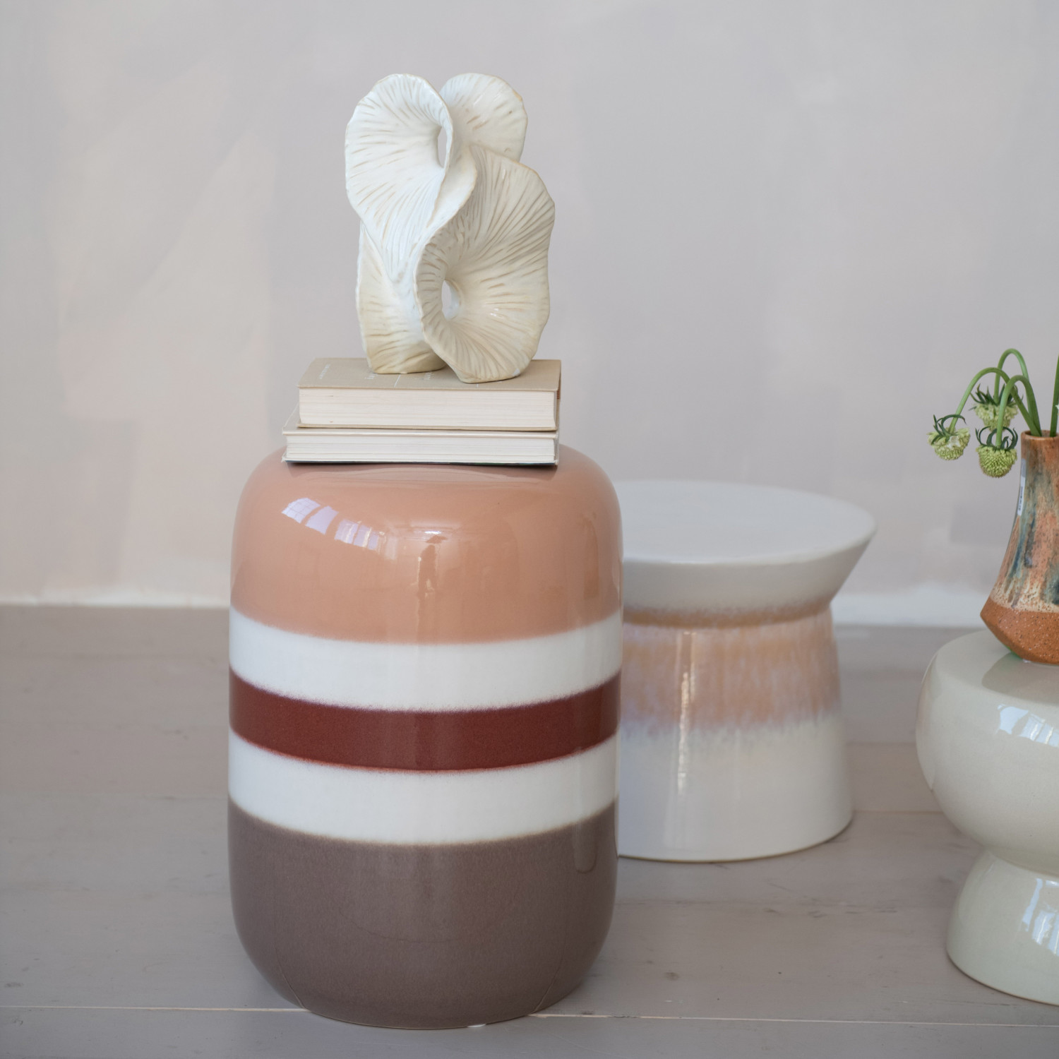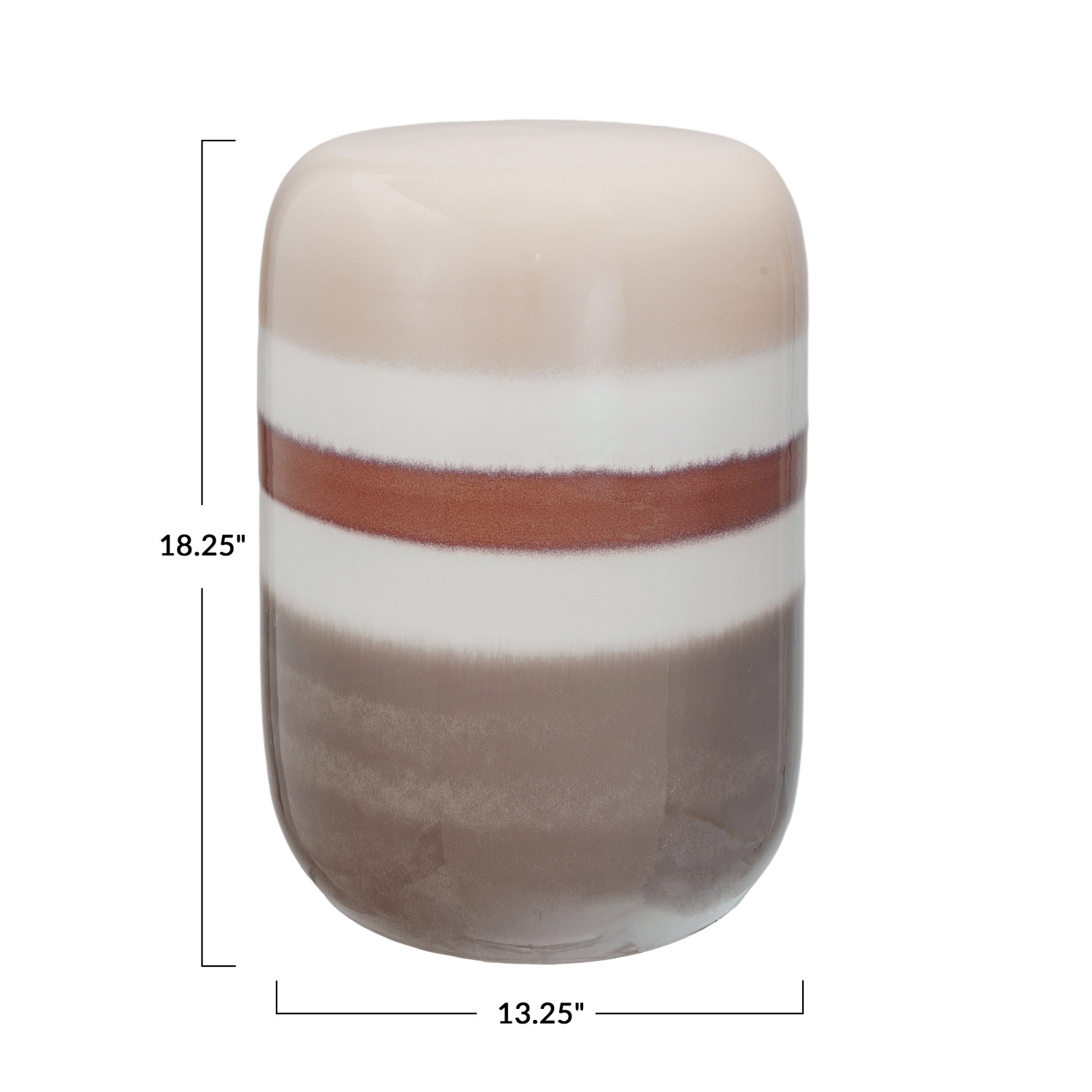 This Stoneware Stool Table, a conversation starter in any room, boasts a mesmerizing reactive glaze that dances with stripes of white, cream, grey, and terra cotta. Each piece is unique, receive a truly one-of-a-kind work of art. Measuring 13.25 inches in diameter and 18.25 inches in height, its versatility allows it to seamlessly transition between a side table displaying varied décor to a comfortable stool for an extra guest. Crafted from high-quality, durable stoneware, this piece arrives fully assembled for immediate enjoyment and is shipped securely via truck for peace of mind. Complete the space with a touch of artistry and function.