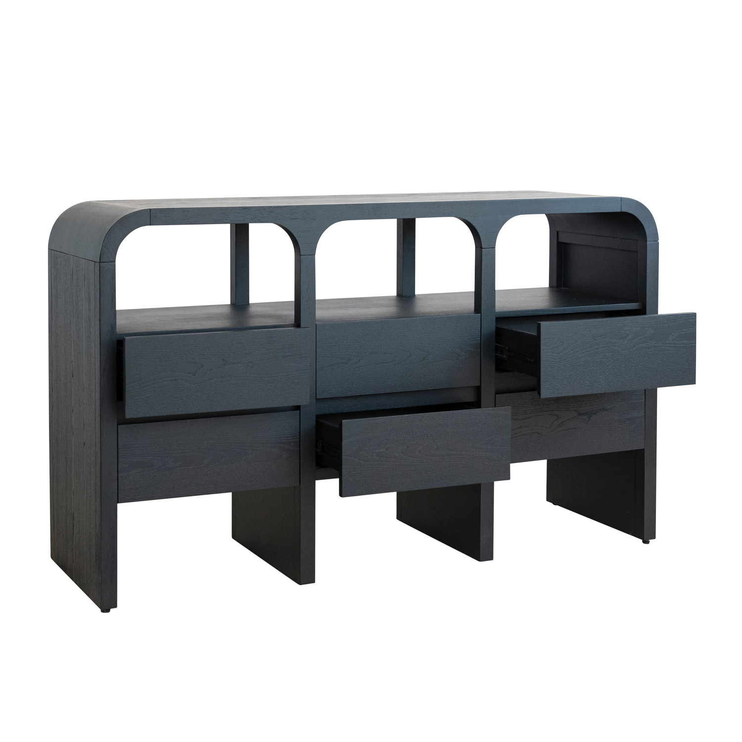 Rubberwood & Oak Wood Veneer Console Table with 3 Shelves & 6 Drawers, Black