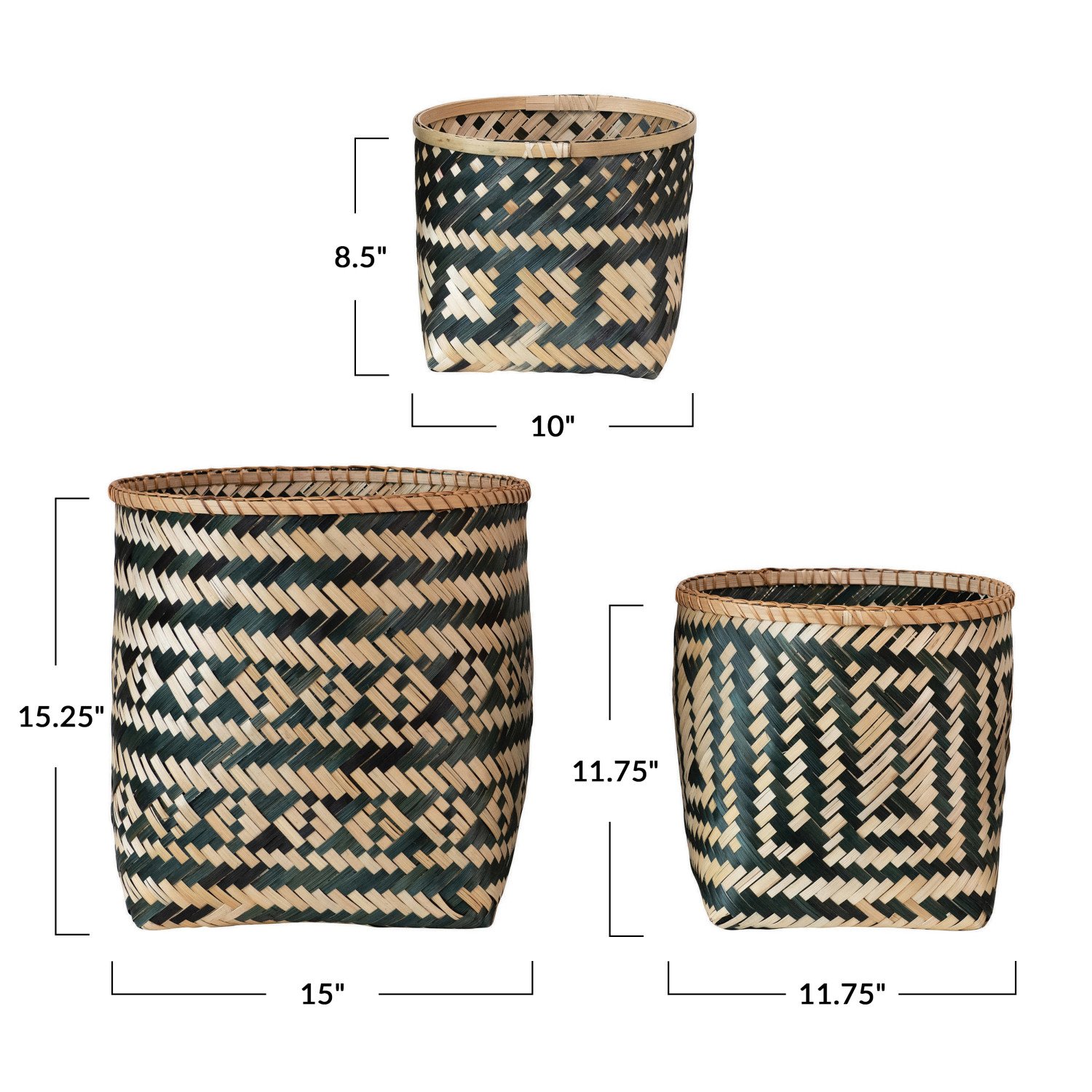 Catalog Name: 15" Round x 15-1/4"H, 11-3/4" Round x 11-3/4"H & 10" Round x 8-1/2"H Bamboo Baskets w/ Pattern, Natural & Black, Set of 3