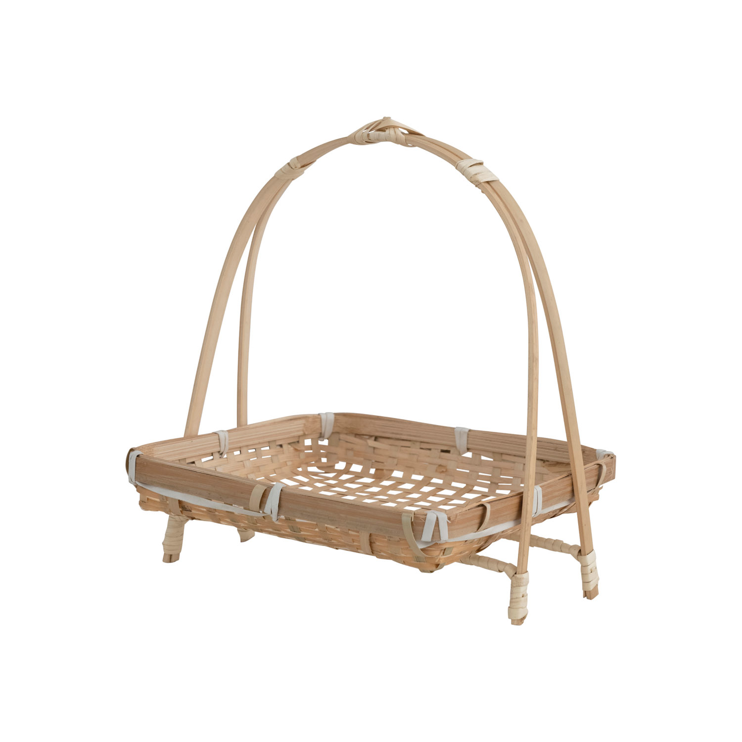 This contemporary boho stand with removable tray showcases organically hand-woven construction and a bold rounded handle. Hand-woven bamboo stand with handle and removable tray. Add a dash of boho charm to any living space with this stylishly versatile stand with tray. Arrange treasured trinkets or small plants for a delightfully eclectic display.