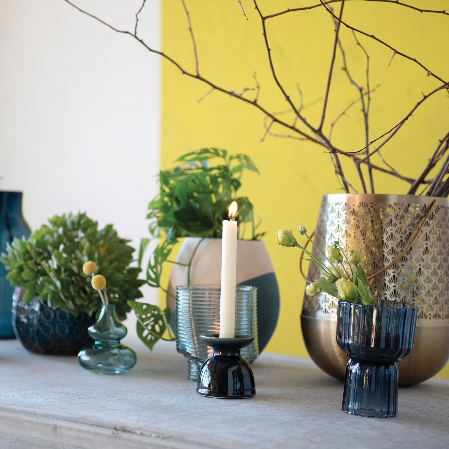 This bold and stylish stoneware pillar or taper candle holder with shiny black finish is an eclectic decor piece. It is a modish, contemporary accent that will be a unique piece in any room in the home or office. Holds standard wax or LED taper or 3" pillar candles. Each unique holder will vary.