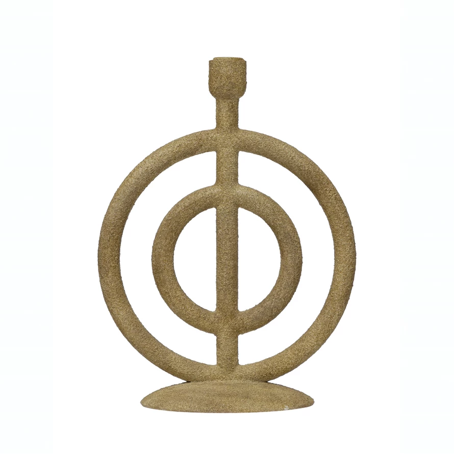 This rustically modern taper candle holder showcases a stunning ringed sculptural base in a distressed sand finish. Beige resin taper candle holder in distressed sand finish. Create the ultimate tablescape with this thoughtfully crafted candleholder. Display this stylishly versatile candle holder as a sophisticated mantel accent or inviting dining table centerpiece.