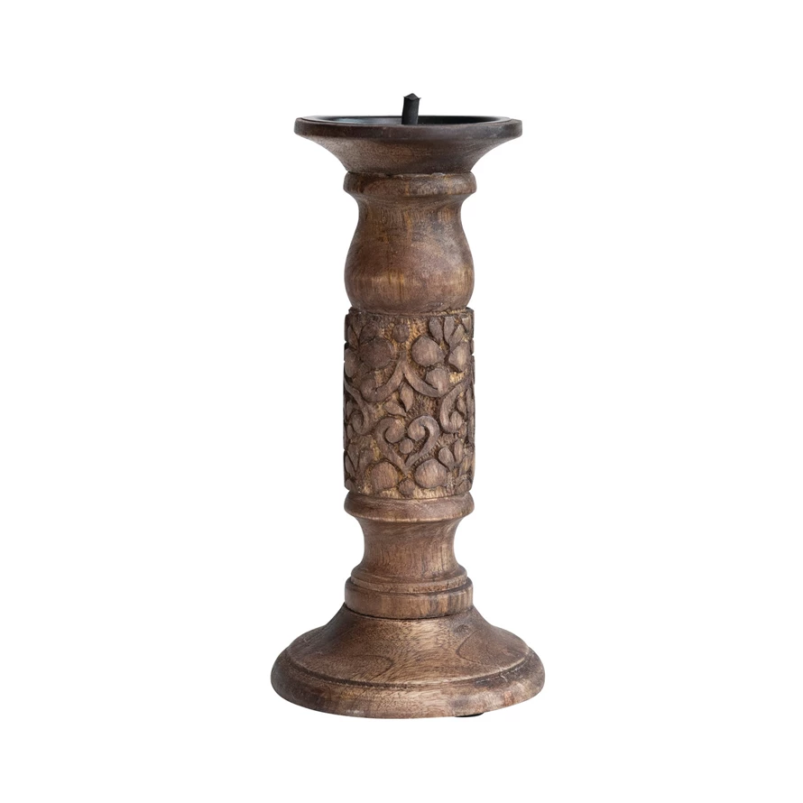 Mix and match the sculptural silhouettes, stylish hues, and unique finishes of our candle and incense holder collection to create the ultimate tablescape. Instantly transform a dining table, dresser, or mantelpiece into a stunning display of ambiance and warmth with carefully chosen bases for a refined candlelight arrangement. Choose from a wide array of materials from iron and marble to wood and stone, and styles from mid-century modern and glam to farmhouse and vintage. From classic taper holders to global-inspired pillar holders and contemporary incense burners and shimmering votives, this collection will create a welcoming atmosphere that is guaranteed to impress. This global-inspired candle holder showcases solid wood construction with a masterfully hand-carved design. Display in a living space of any style from global to farmhouse. Wipe clean with dry cloth. Made from mango wood and iron.
