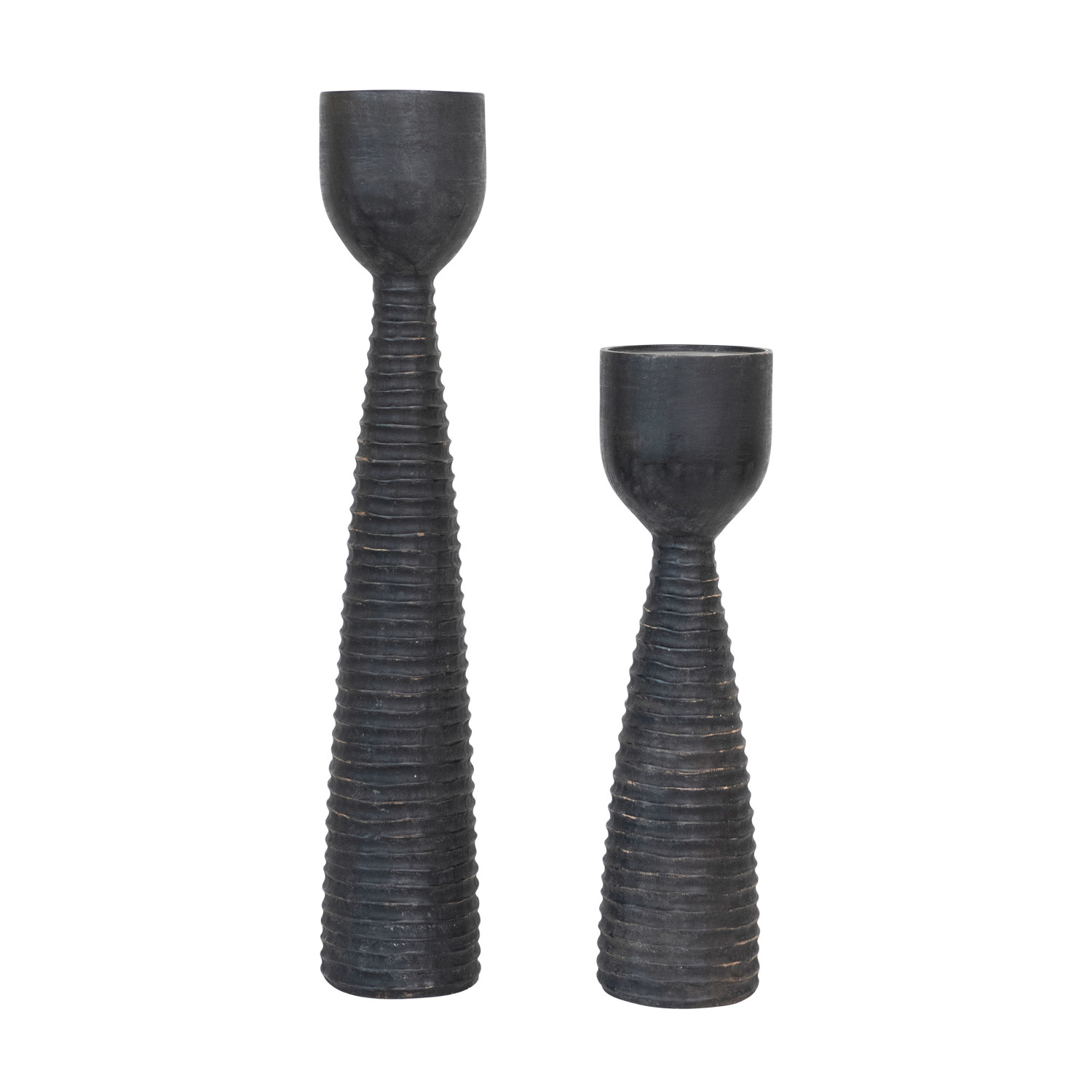 Illuminate the home with this black mango wood ribbed candle holder. This candle holder features a hand-carved mango wood construction that has a ribbed texture and a black finish. The mango wood material is pure and eco-friendly, as it comes from trees that are harvested after they stop producing fruit. The candle holder has a round base and a round top that can hold a 4-inch pillar candle (not included) creating a cozy and romantic atmosphere. It measures 5 inches in diameter and 20 inches in height. Whether used as a standalone piece or with a matching set, this candle holder will be a stunning accent for a table centerpiece, mantelpiece, or fireplace. A tall and slender candle holder with a hand-carved mango wood construction and a black finish. Suitable for any home decor style, especially rustic, dark, or timeless. Perfect for adding some height and elegance to a table centerpiece, a mantelpiece, or a fireplace. Made of pure mango wood.