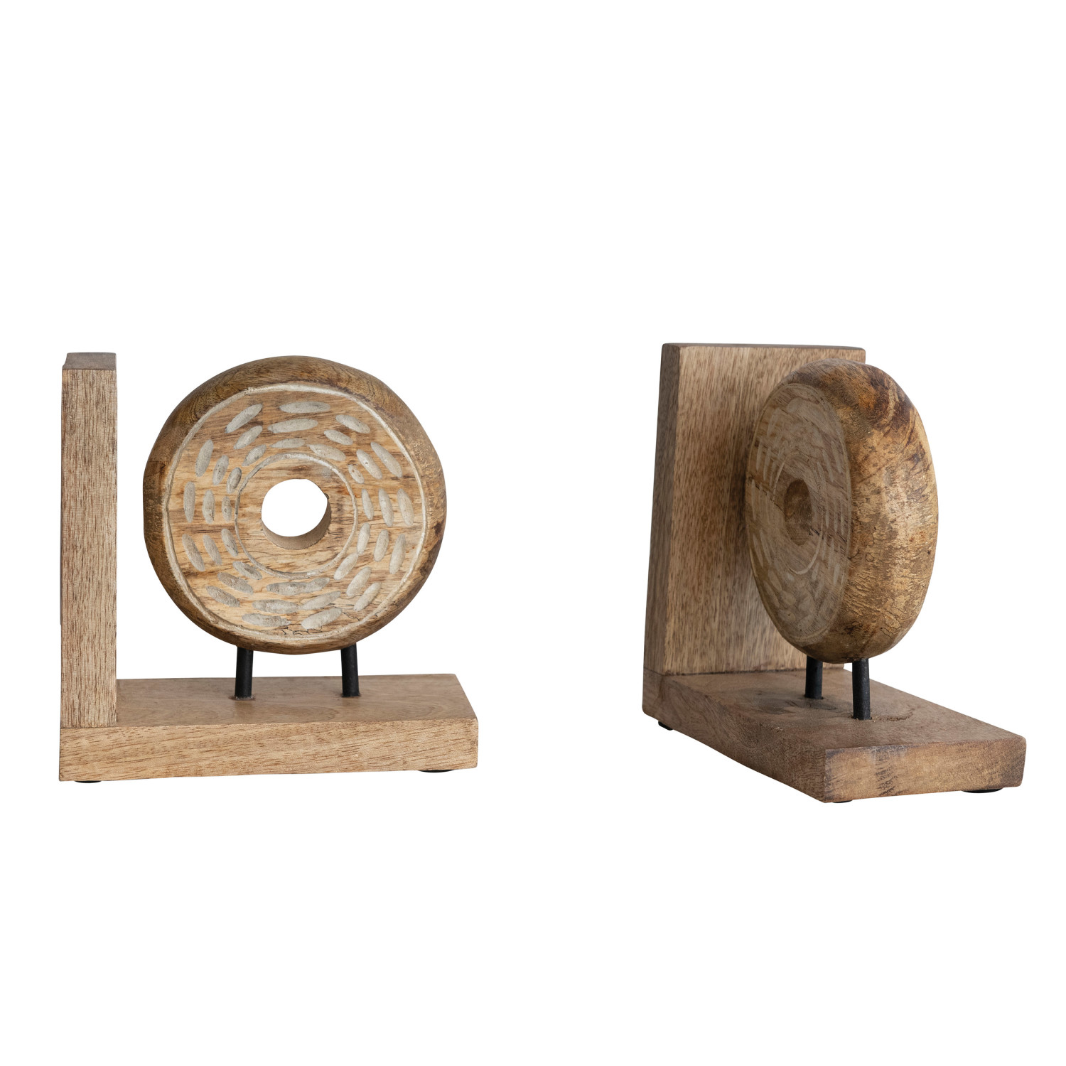 Catalog Name: 6-3/4"L x 3-1/2"W x 6-1/2"H Hand-Carved Mango Wood & Metal Circle Bookends on Stand, Natural, Set of 2