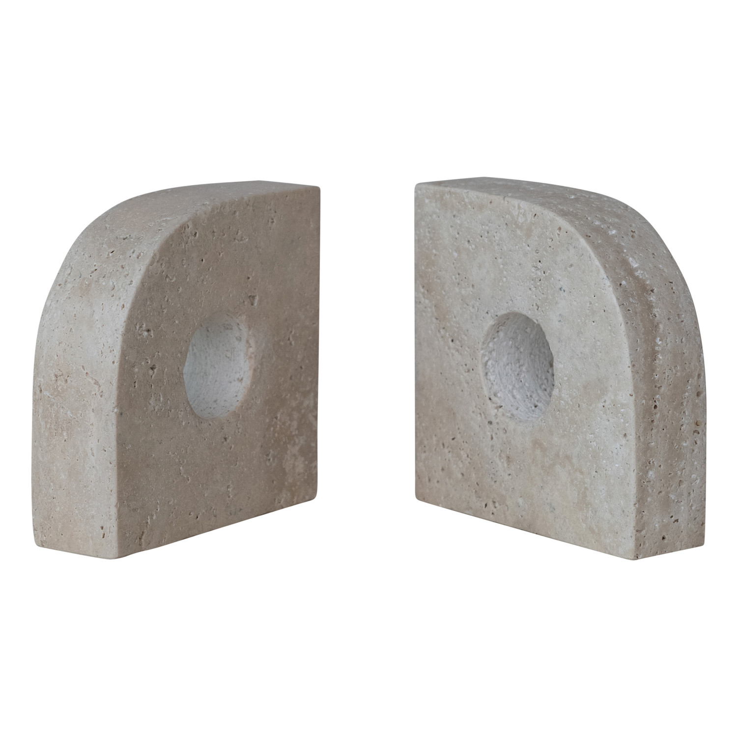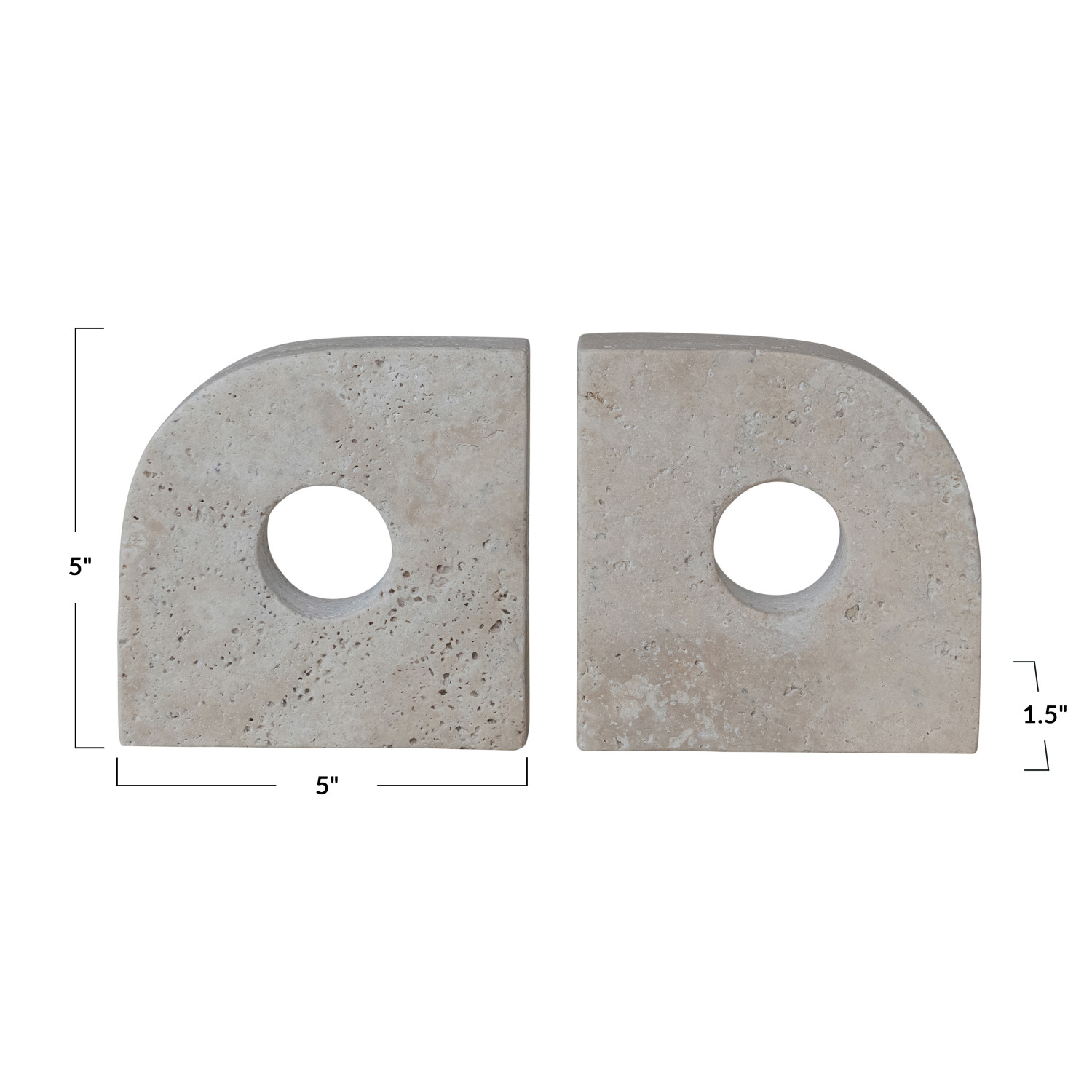 Travertine Bookends w/ Circle Cut-Outs, Beige, Set of 2 (Each One Will Vary)