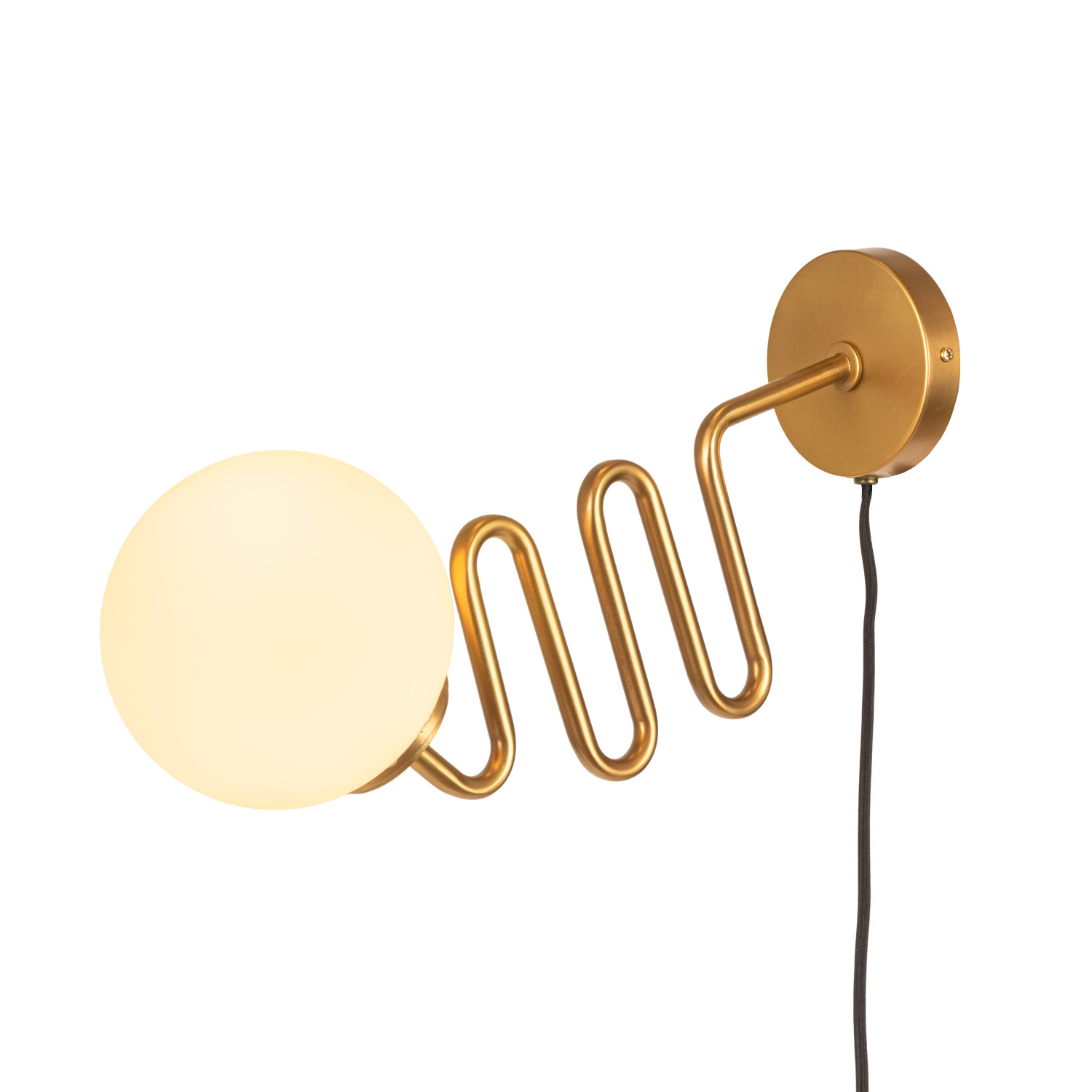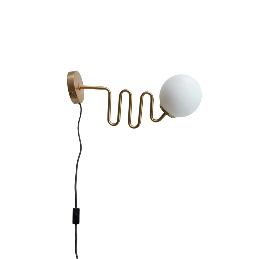 Catalog Name: 18"W x 4-1/2"D x 8"H Metal, Glass & MDF Wall Sconce w/ Glass Globe & Inline Switch, 6' Cord, Gold Finish, Frosted White