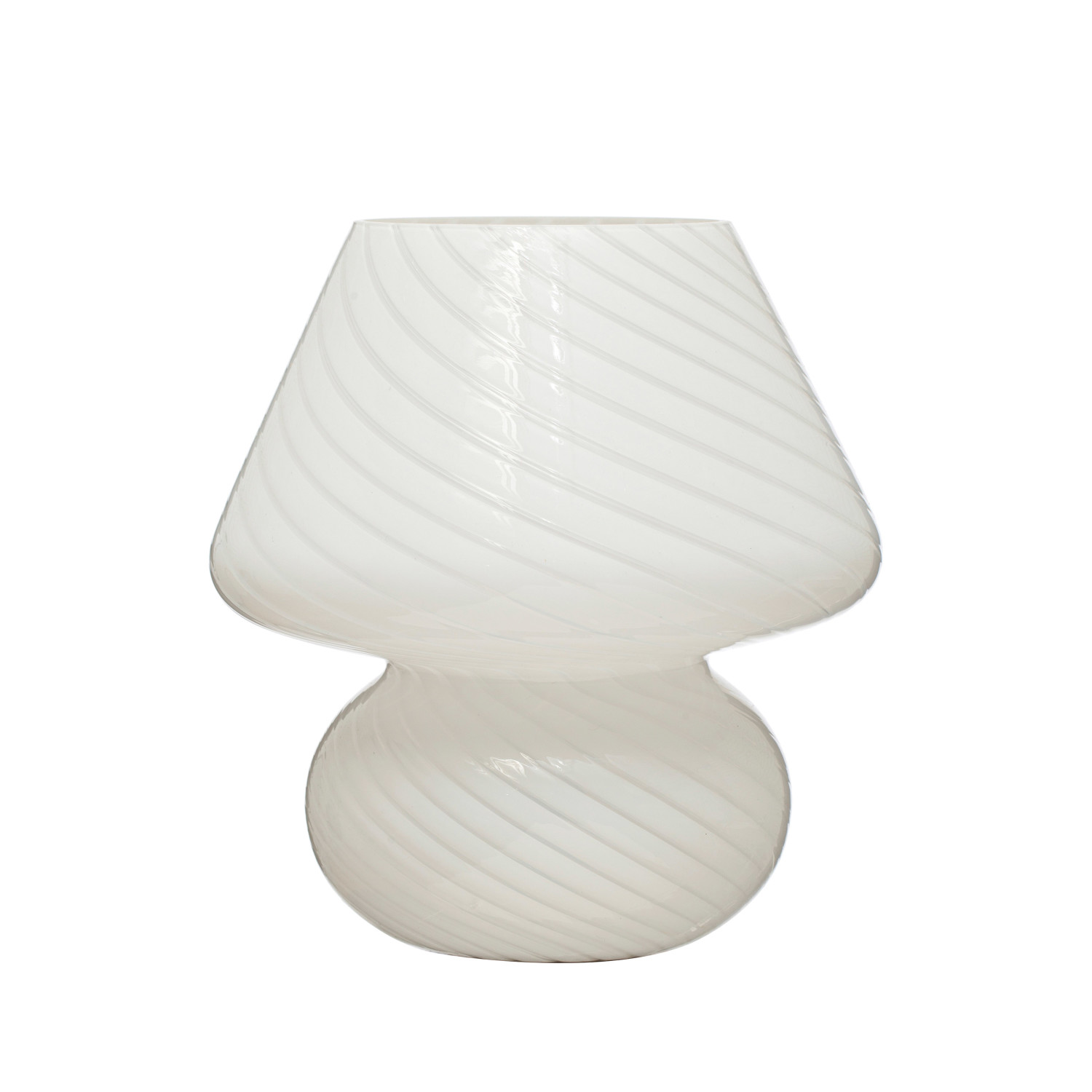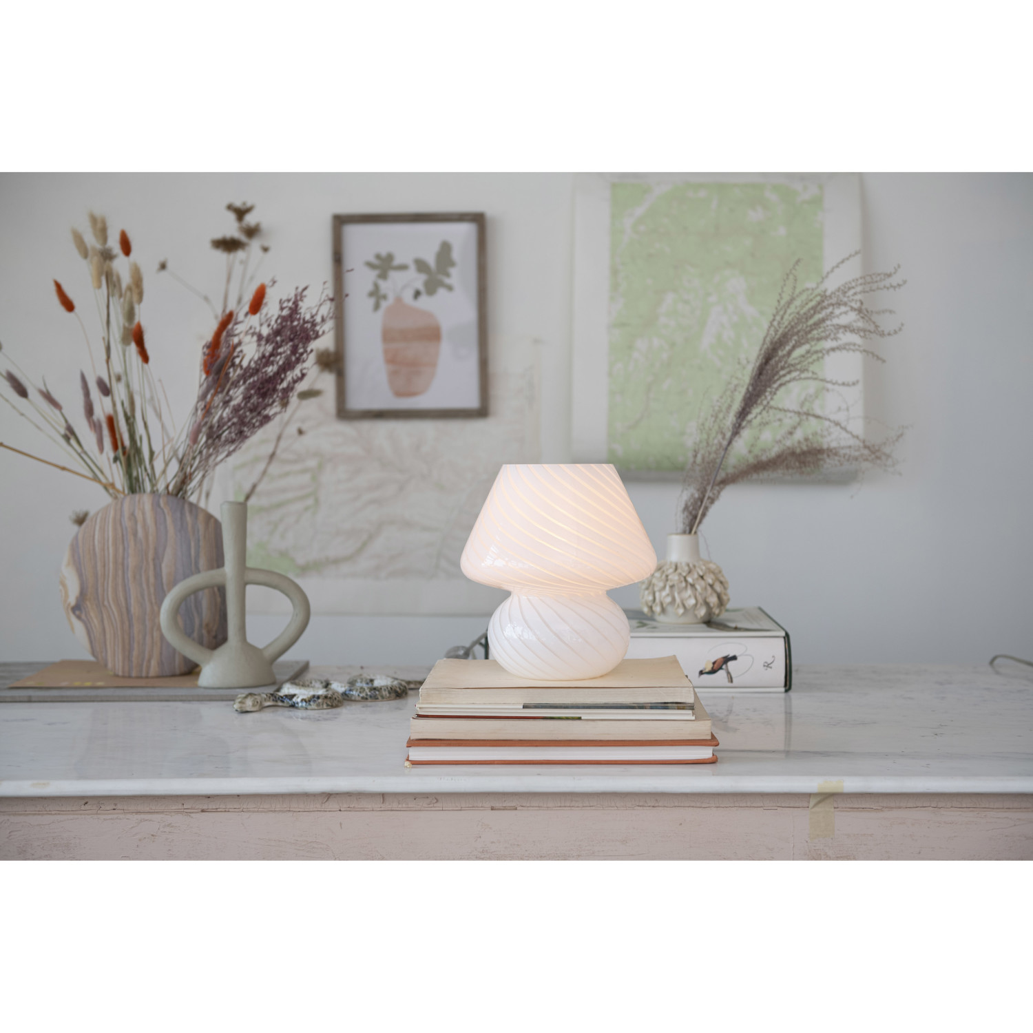 Illuminate the space with this white blown glass table lamp with a contemporary design. This table lamp showcases a vintage-inspired, blown glass silhouette that creates a unique and artistic look. The glass base has a milky white finish that adds a touch of elegance and simplicity to the lamp, while the metal base has a silver finish that adds a touch of contrast and stability to the lamp. The lamp is topped with a simple white shade that diffuses the light softly and evenly, creating a cozy and inviting ambiance. This table lamp is suitable for any living space that needs elegance and simplicity, such as the living room, bedroom, office, or any other area. It can also be an excellent gift for anyone who loves modern, minimalist, or Scandinavian design. This table lamp requires one 40-watt bulb (not included) and is conveniently equipped with an in-line switch. It measures 8.25 inches in diameter and 9.25 inches in height, and the cord length is 6 feet. Add this white blown glass table lamp to the home and enjoy its beauty and functionality. A contemporary table lamp that features a vintage-inspired, blown glass silhouette in a milky white finish. This lamp would add a touch of elegance and simplicity to any living space, especially for modern, minimalist, or Scandinavian home décor styles. Requires 1 40-watt bulb (not included); equipped with an in-line switch for convenience. Made of glass and metal materials.