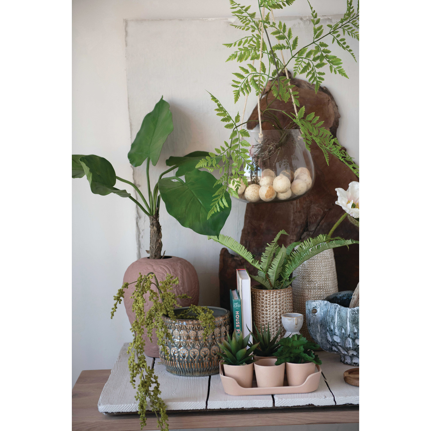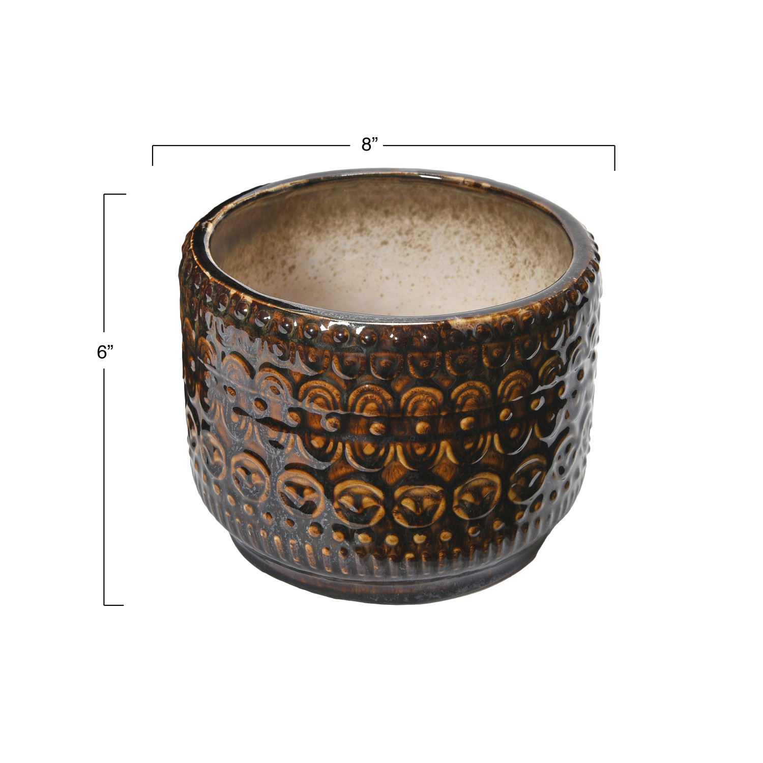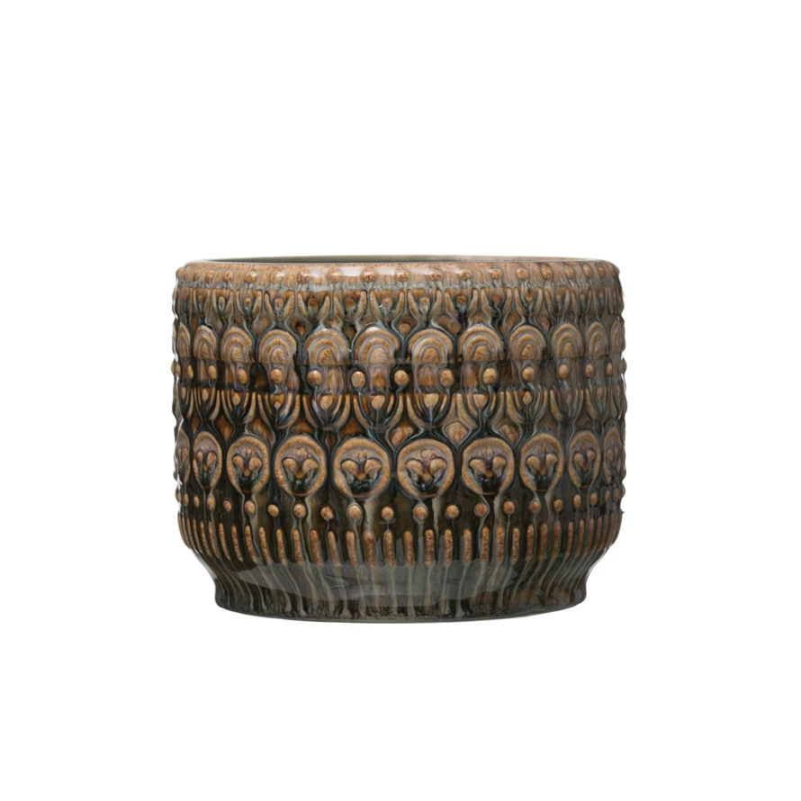 With detailed embossing and a distressed finish, this stoneware planter features a remarkable reactive glaze finish. The glazing process creates individual works of art on each distinctive piece. Fill it with a potted plant and display on a tabletop or mantel for an amazing accent to the room decor.