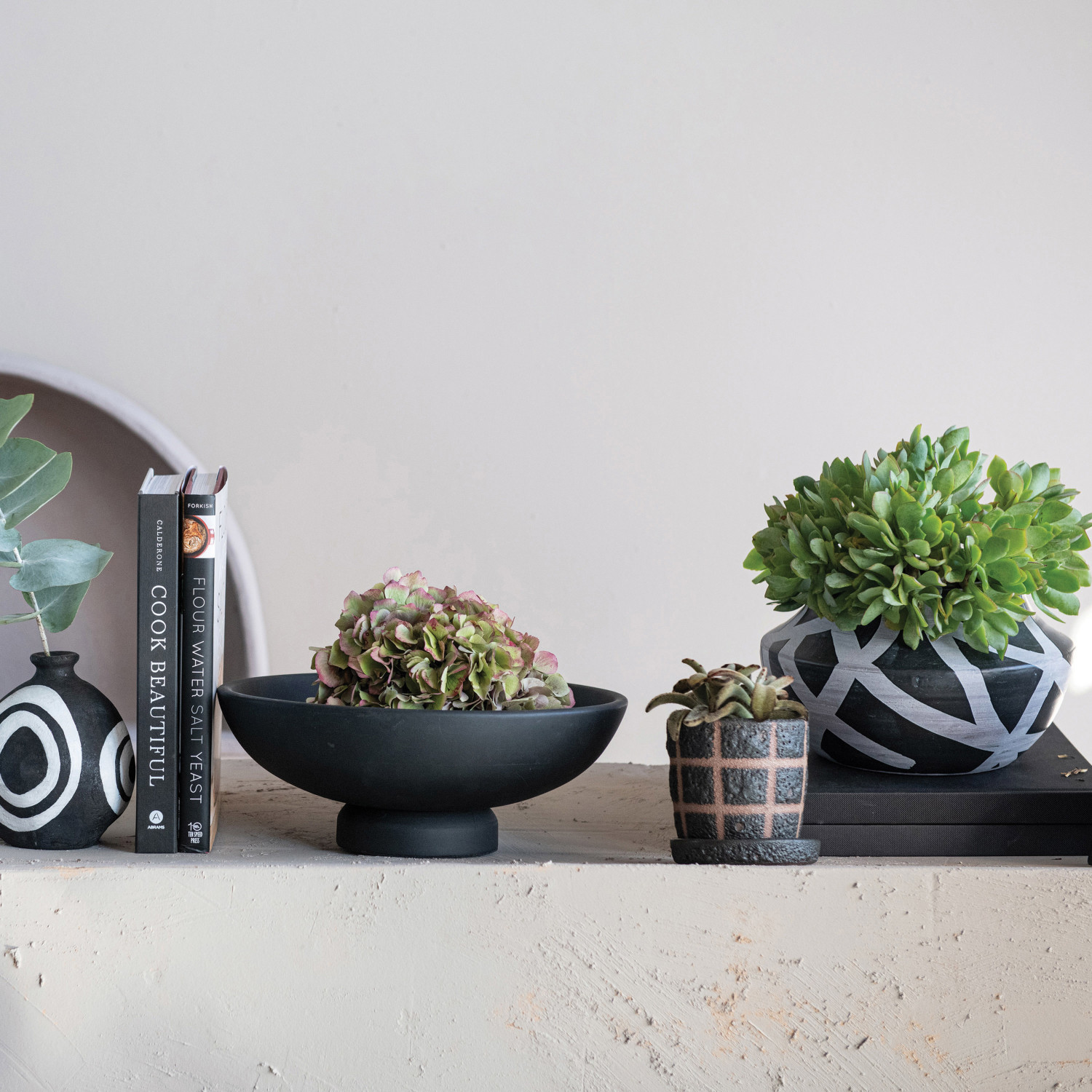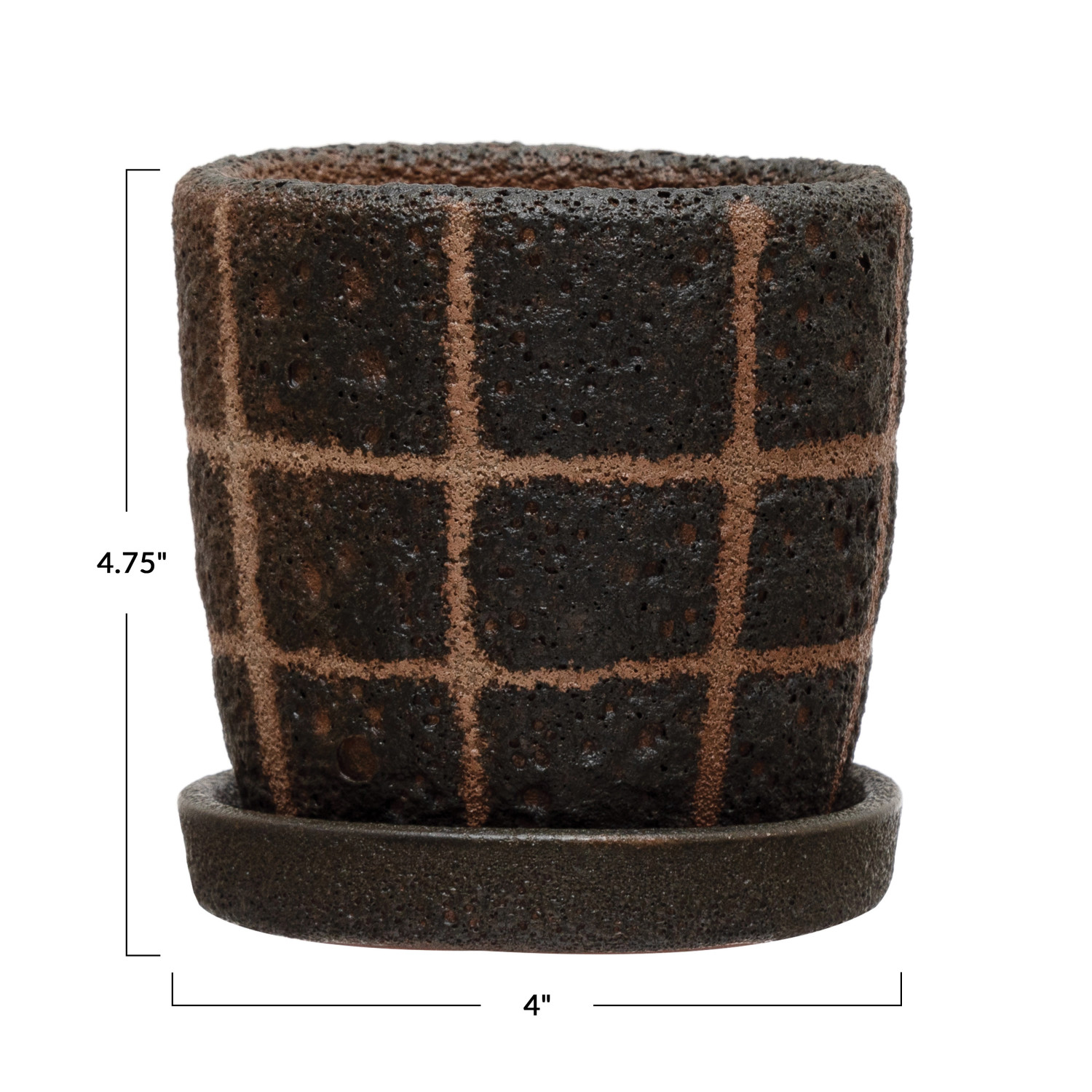 This planter and saucer is perfect for any florals or plants. Made out of terracotta, this planter features a unique brown and black grid pattern that effortlessly lends boho elements to any space. Whether outside or inside, this planter holds a 3" pot.