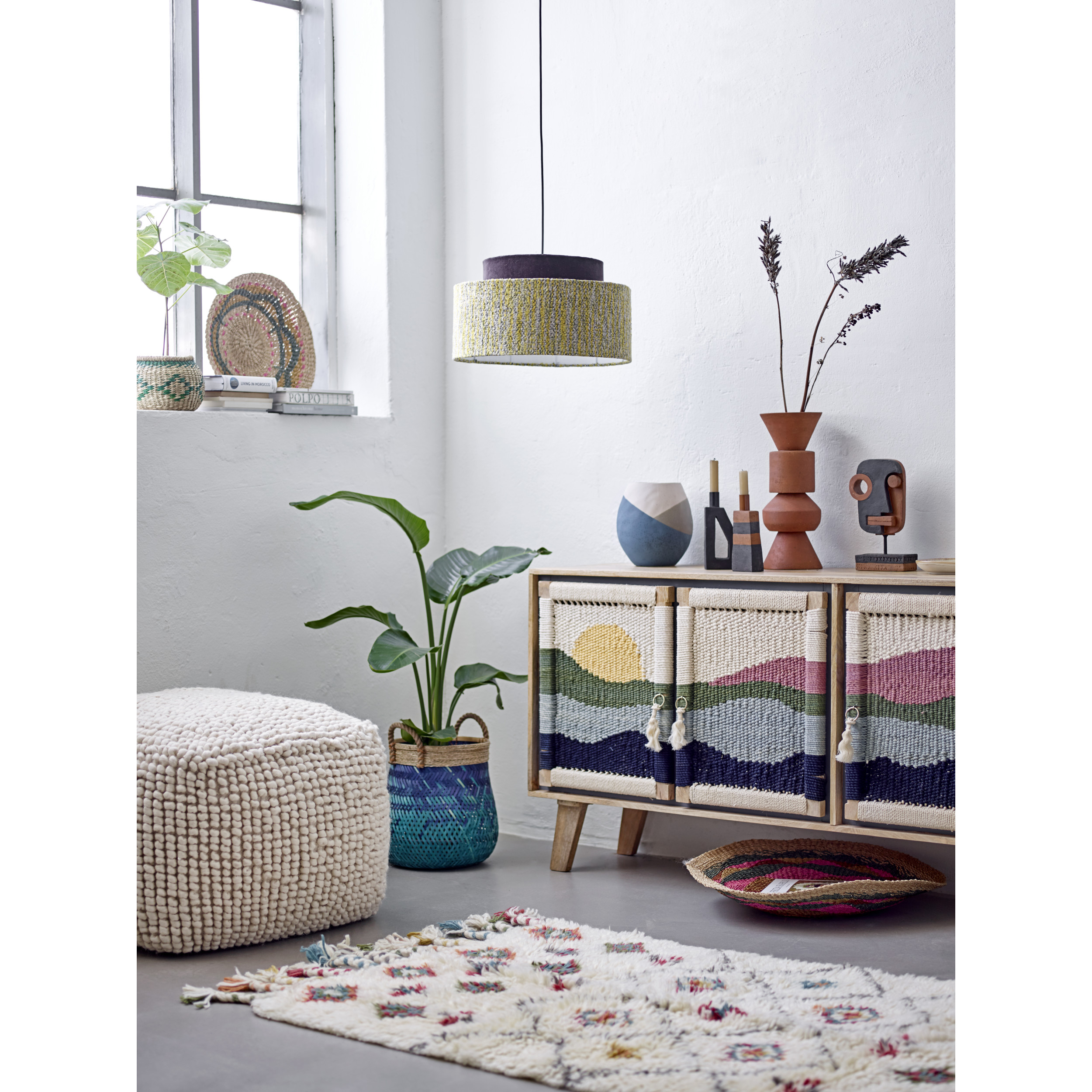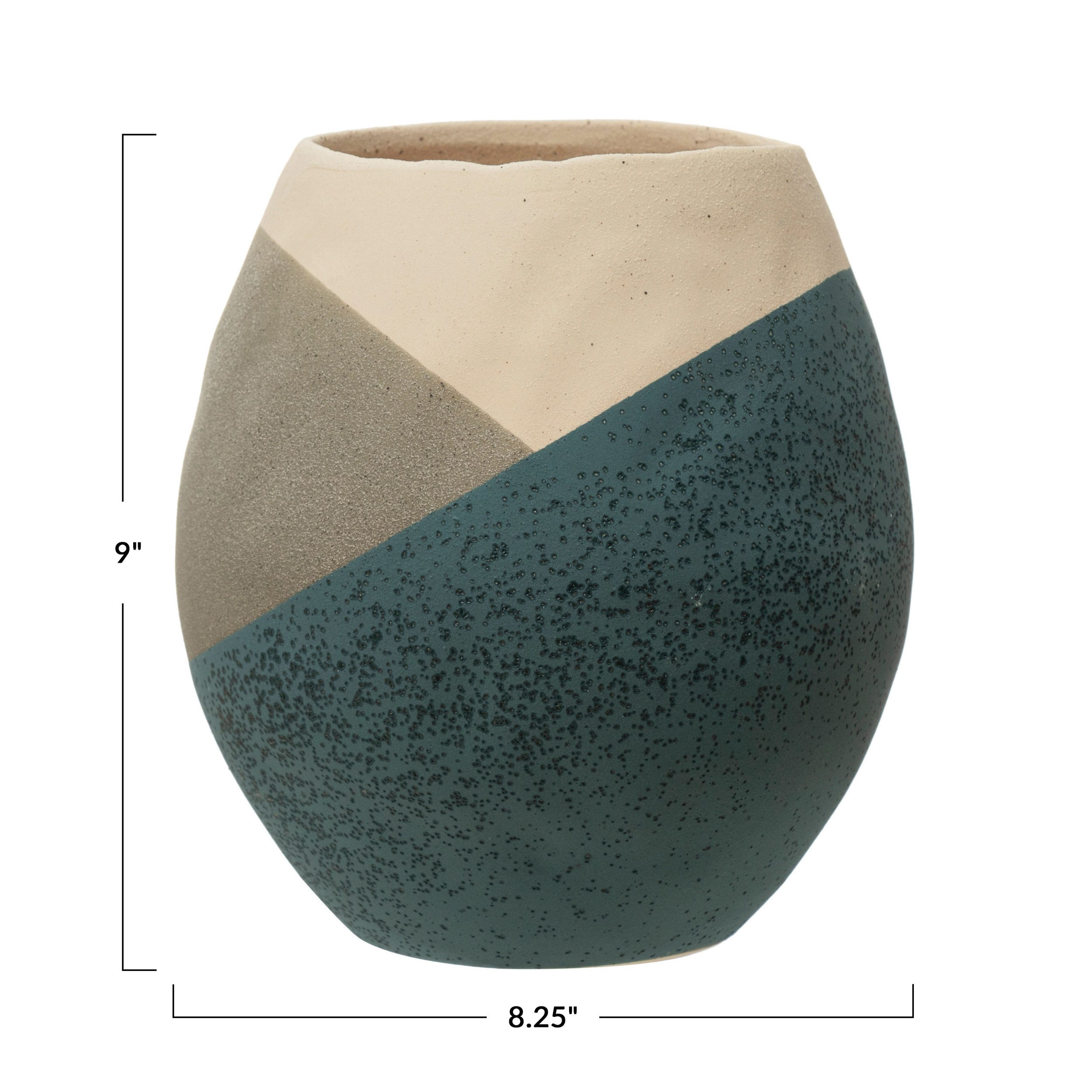 This splendid hand-painted stoneware planter has a gorgeous multi-colored and multi-textured finish. It adds a modish contemporary touch and will look great on a table, mantle, dresser, or bookshelf. This stoneware planter is a contrast of cream, greyish beige, and blueish green, with three different variations of sand-textured finish. Additionally attractive as a decorative accent piece or filled with faux or dried stems. Planter holds a 5" pot.
