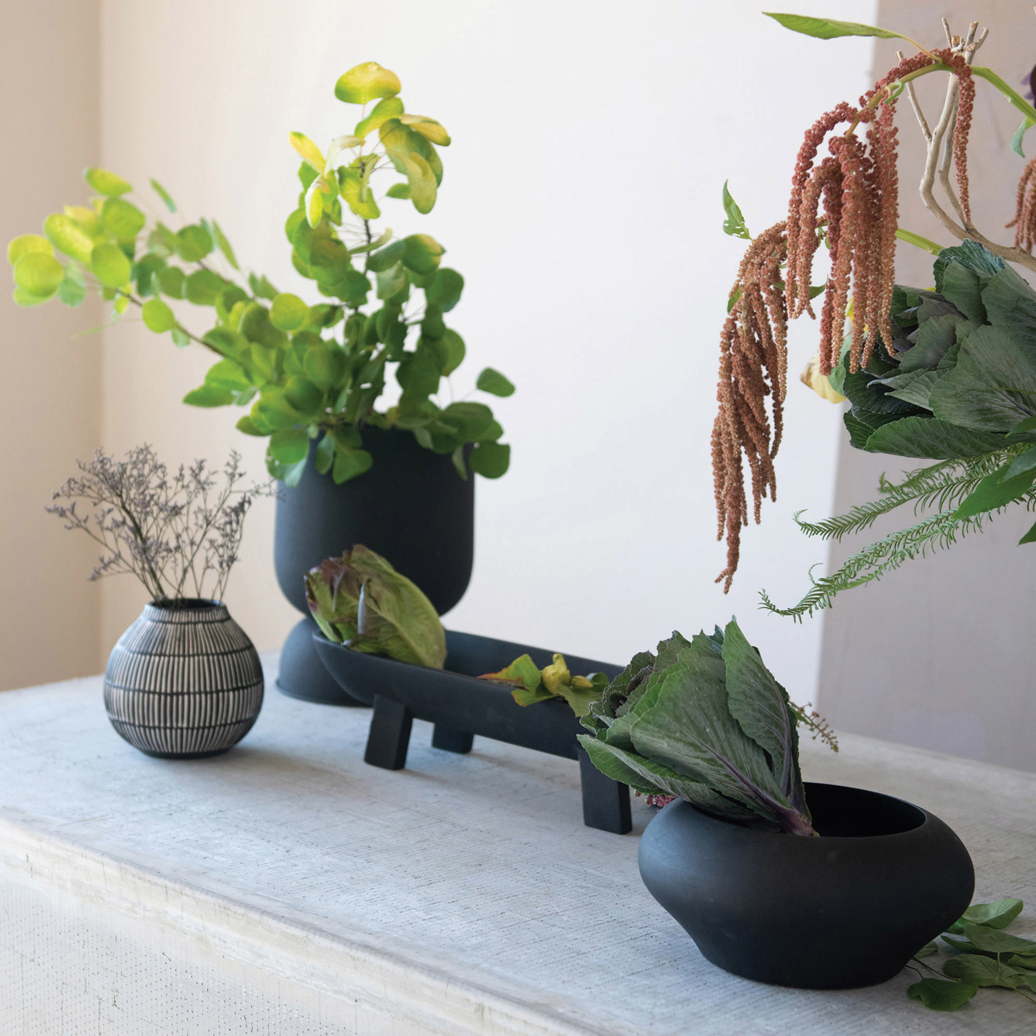 These handsome matte black, textured metal footed planters are a great addition to your store. They have a bold and stylish shape that makes this set a unique and attractive accent for any living room, kitchen, office, or sunroom. Comes in a matching set of three; holds 9", 8", and 7" pots.