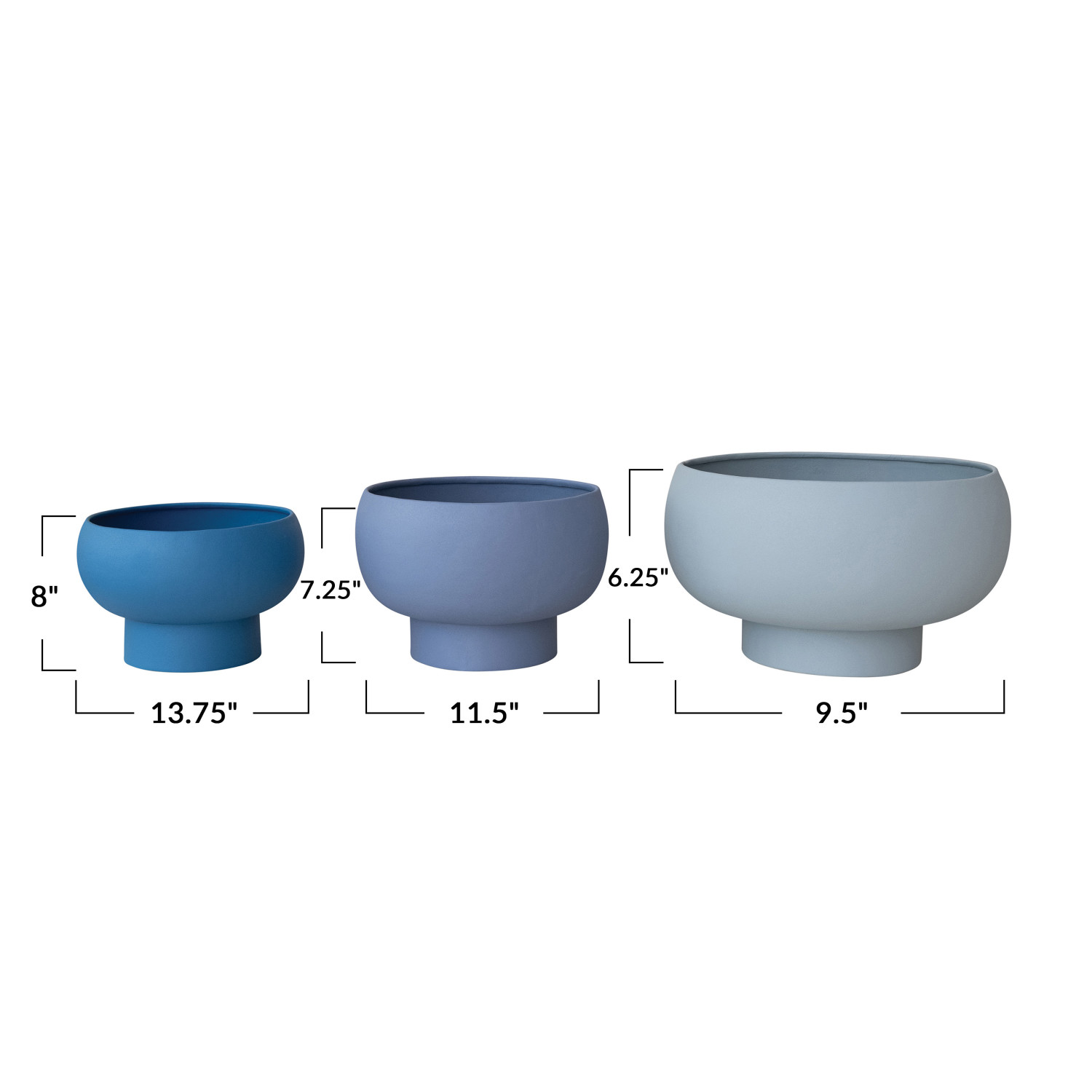 Catalog Name: 13-3/4" Round x 8"H, 11-1/2" Round x 7-1/4"H & 9-1/2" Round x 6-1/4"H Metal Footed Planters, Blue, Set of 3 (Holds 12", 10" & 8-1/2" Pots)