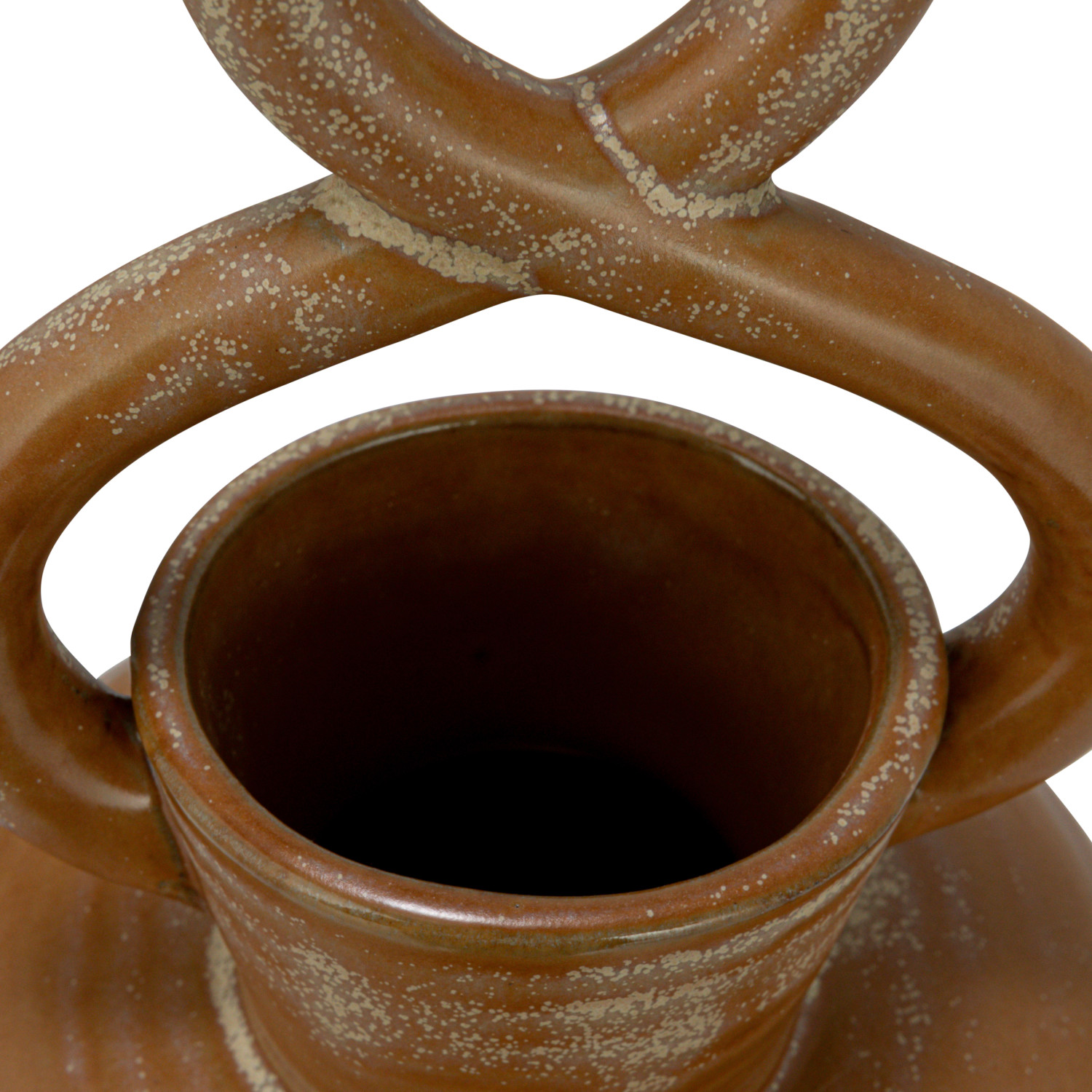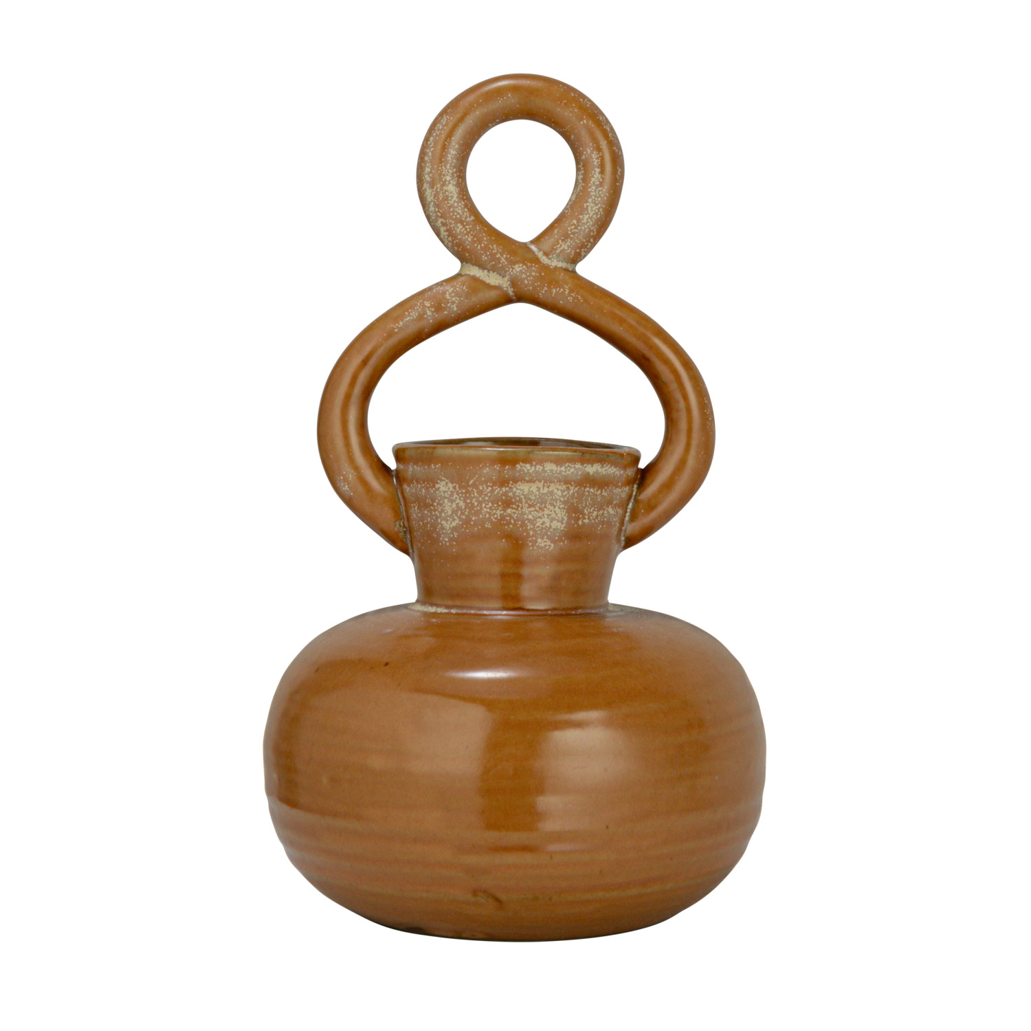 This round decorative brown stoneware vase with a twisted handle and reactive glaze is a beautiful and unique addition to any home. The reactive glaze gives the vase a unique and eye-catching appearance, while the twisted handle adds texture and dimension to the vase. It is made of high-quality stoneware that is durable, sturdy, and easy to clean. The vase measures 5.13 inches in diameter, and 8.5 inches tall. It can hold a single stem or small flowers or plants, enhancing the beauty and symmetry of the space. This vase would look great in a coastal, bohemian, or any other style of home décor. Don't miss this opportunity to own this item and add beauty and elegance to the space. A rustic and charming vase with a round shape, a twisted handle, and a reactive glaze that creates a unique and varied pattern. Perfect for farmhouse, country, or vintage style home décor, this vase can add some warmth and character to any space. Features a narrow opening that can hold a single stem or a small bouquet of flowers or plants. Made of stoneware.