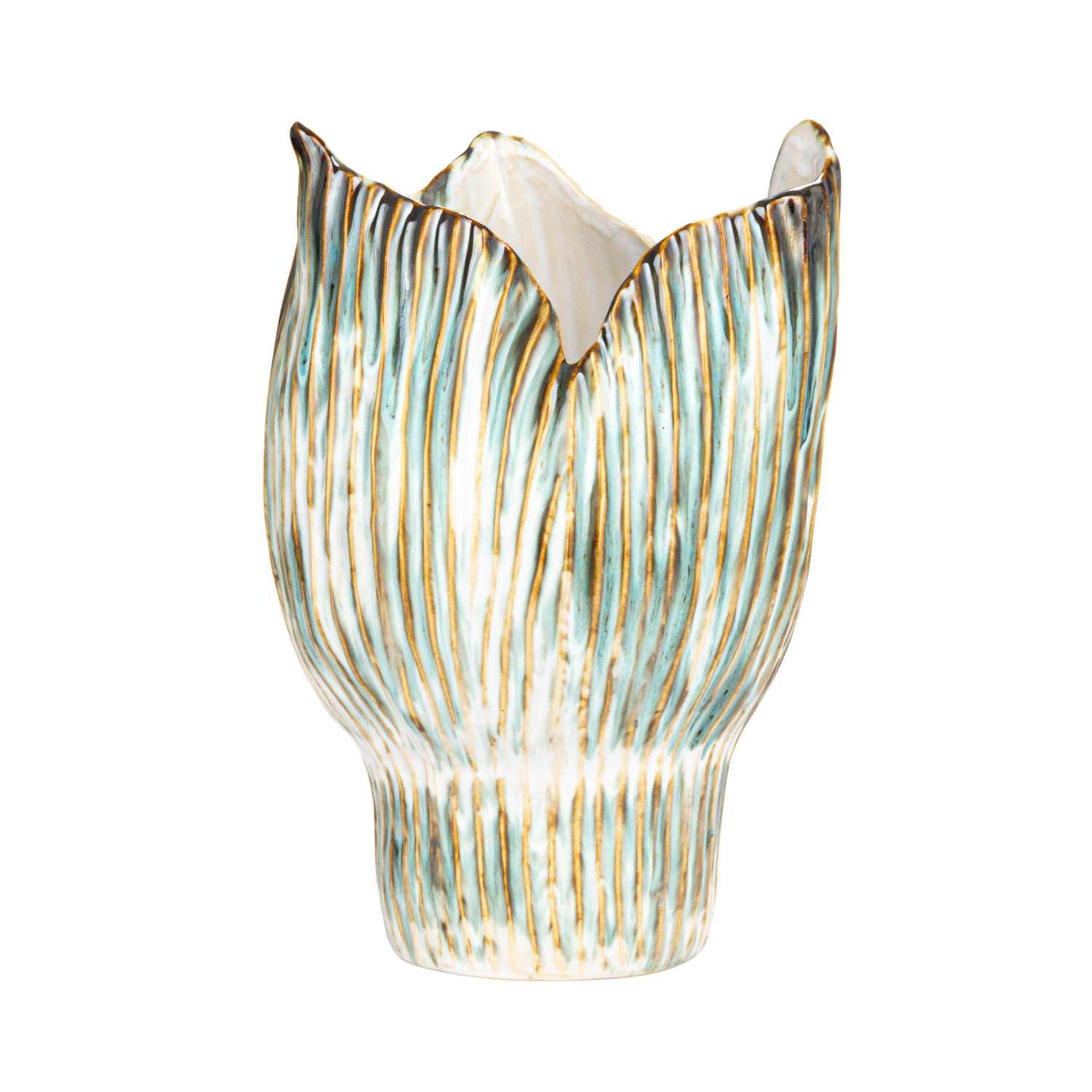 This stoneware pleated sculptural vase, featuring a green and white color and reactive glaze, is a stylish and elegant home accessory. Made of dense, hard stoneware, it features a round shape with a wide opening and pleated design for a sculptural and geometric effect. The vase's fresh and elegant green and white color adds a fresh and elegant look. It can be used as a decorative accent or to hold flowers, plants, or branches, creating a contemporary and sophisticated atmosphere. Place it in any room of the house, from the living room to the bedroom, and create a contemporary and sophisticated atmosphere. Ideal for Scandinavian, boho, global, modern, or French country style, this vase adds texture and interest to any space. It makes a great gift for art and design enthusiasts. Each vase may vary slightly in color and pattern due to the reactive glaze.
