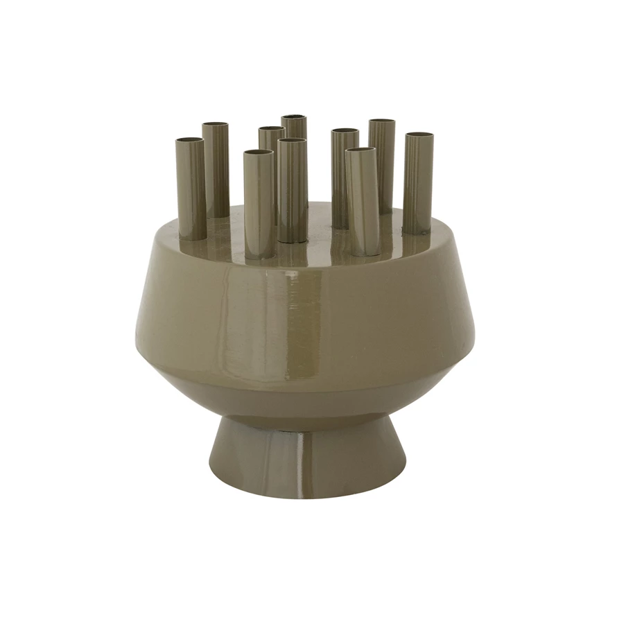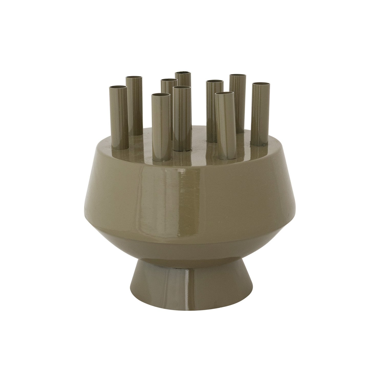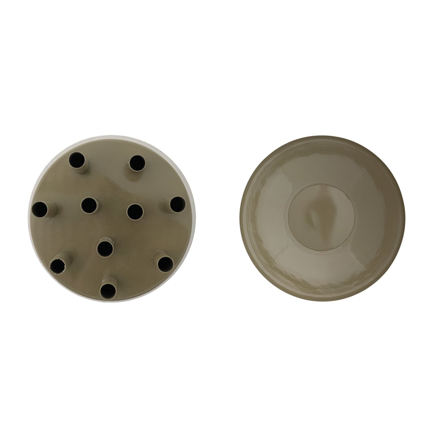 Catalog Name: 10-3/4" Round x 10-3/4"H Enameled Metal Footed Multi-Stem Flower Vase w/ Removable Frog Lid & 10 Openings, Olive Color