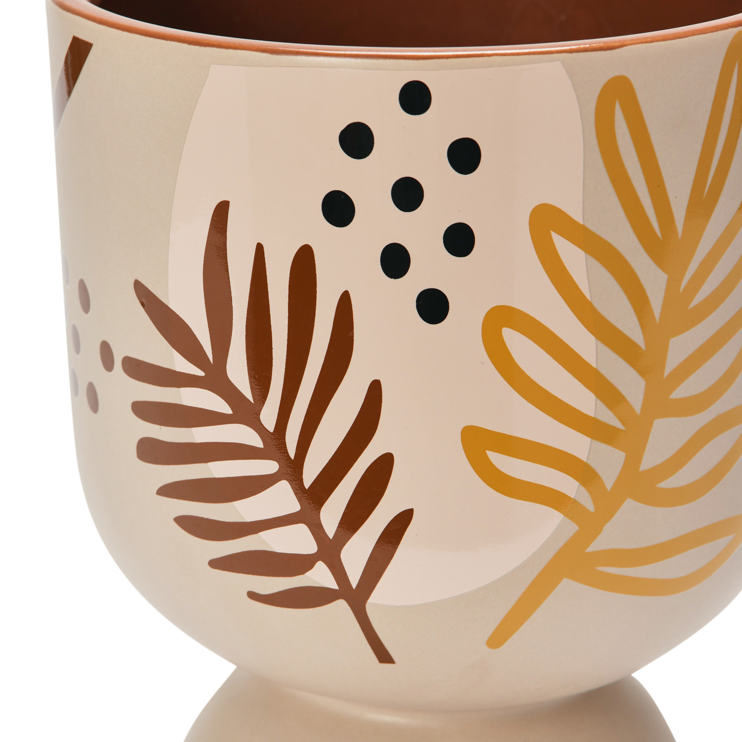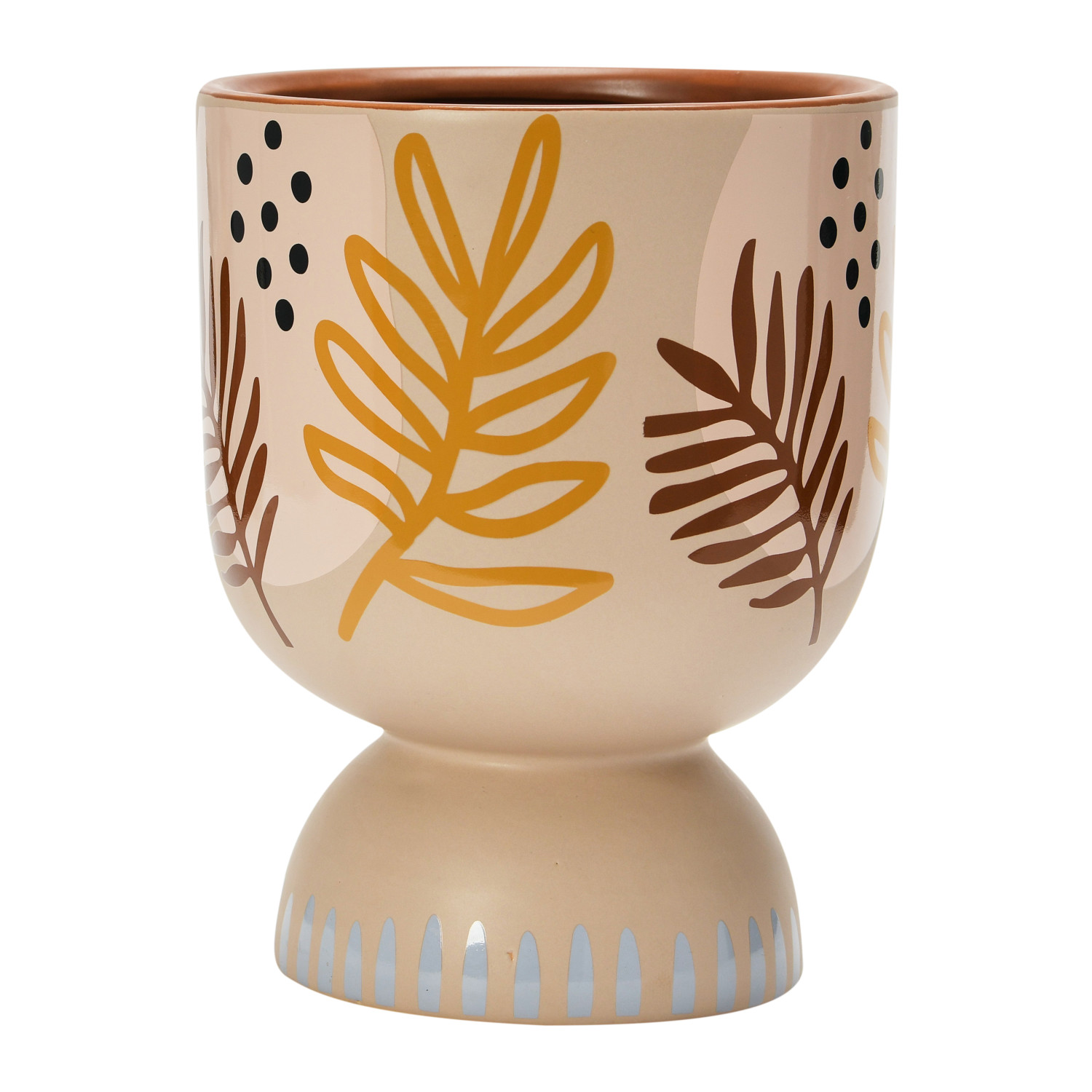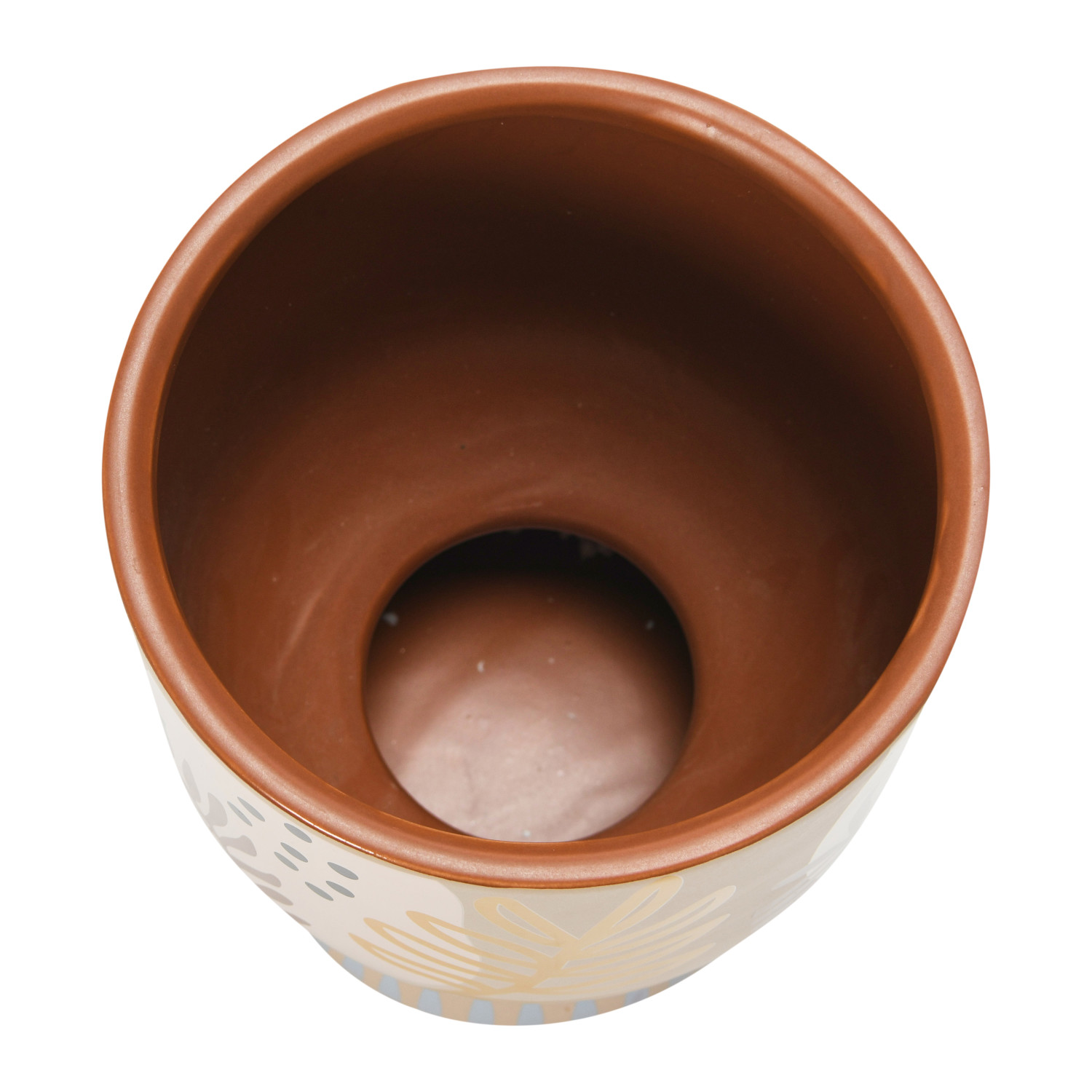 This playfully modern stoneware planter showcases a contemporary silhouette with an abstract floral design. Stoneware planter with multicolor abstract floral pattern. Add a hint of modern art to any living space with this contemporary planter. Made from 100% stoneware.