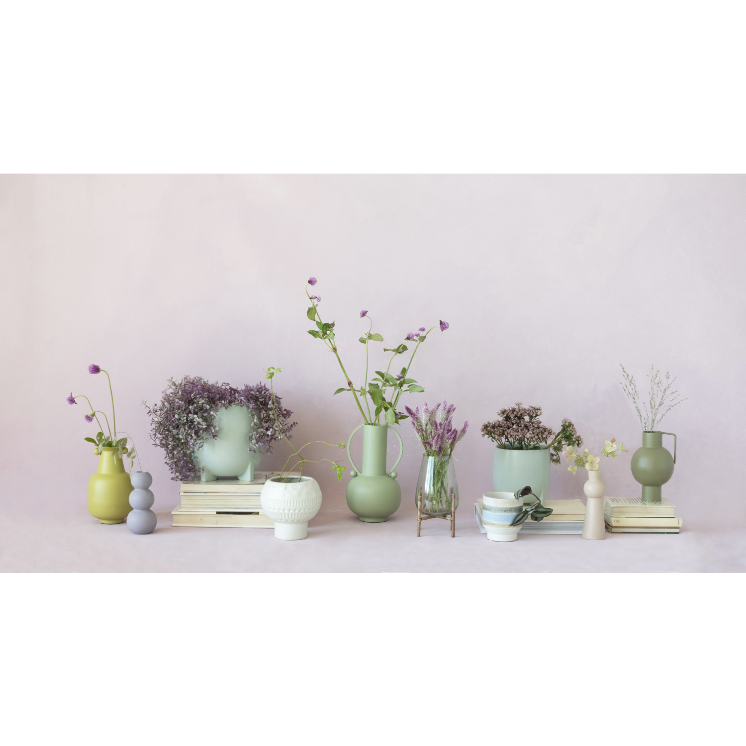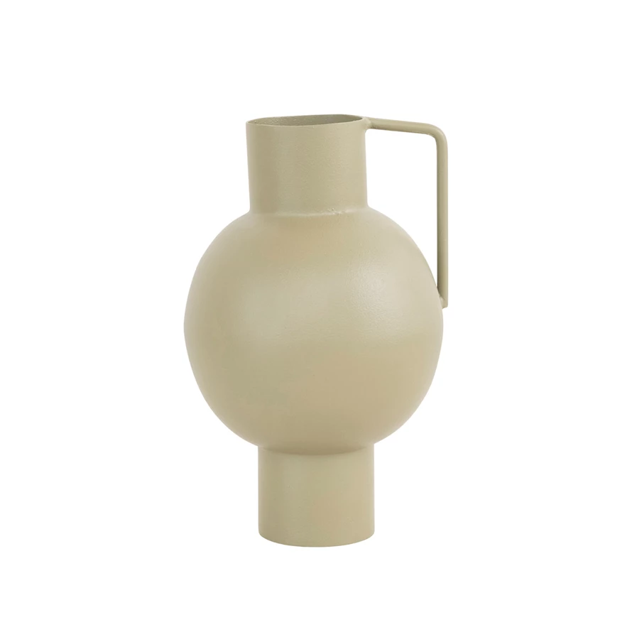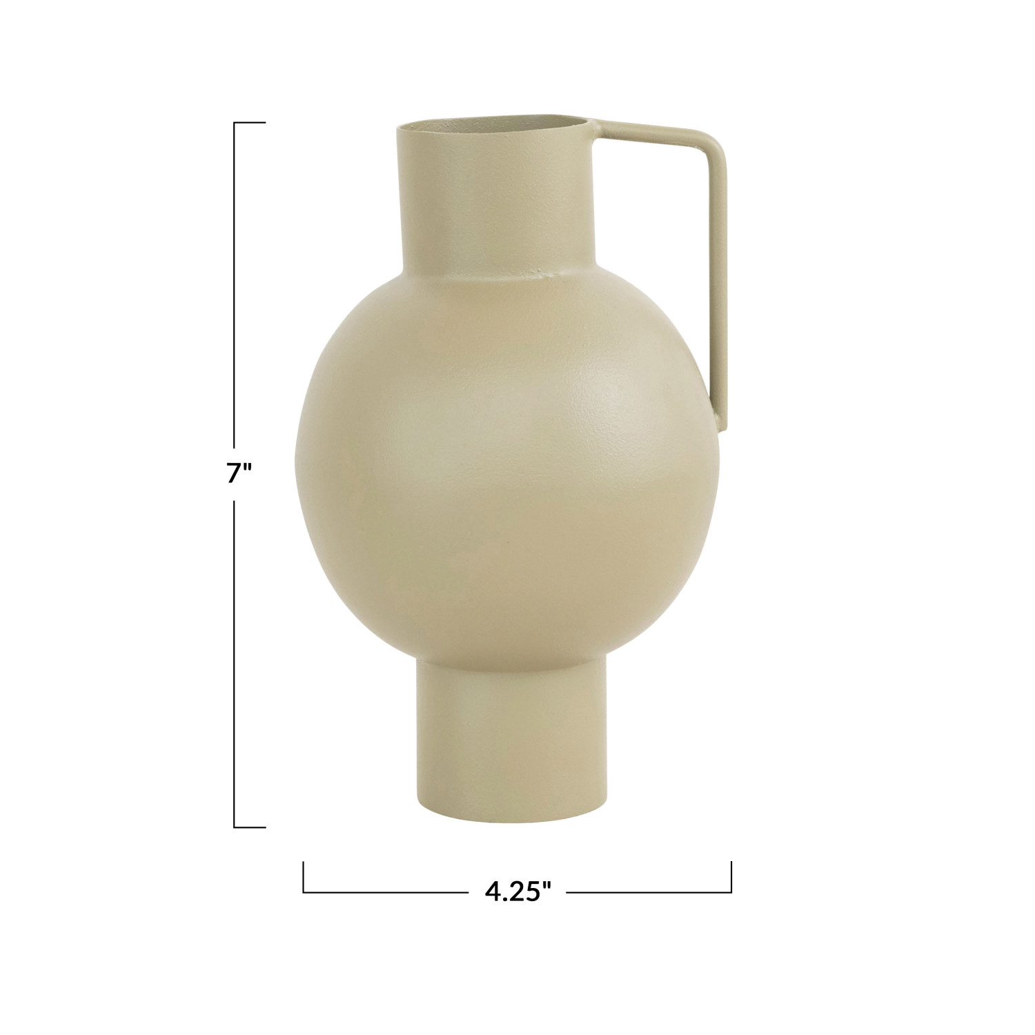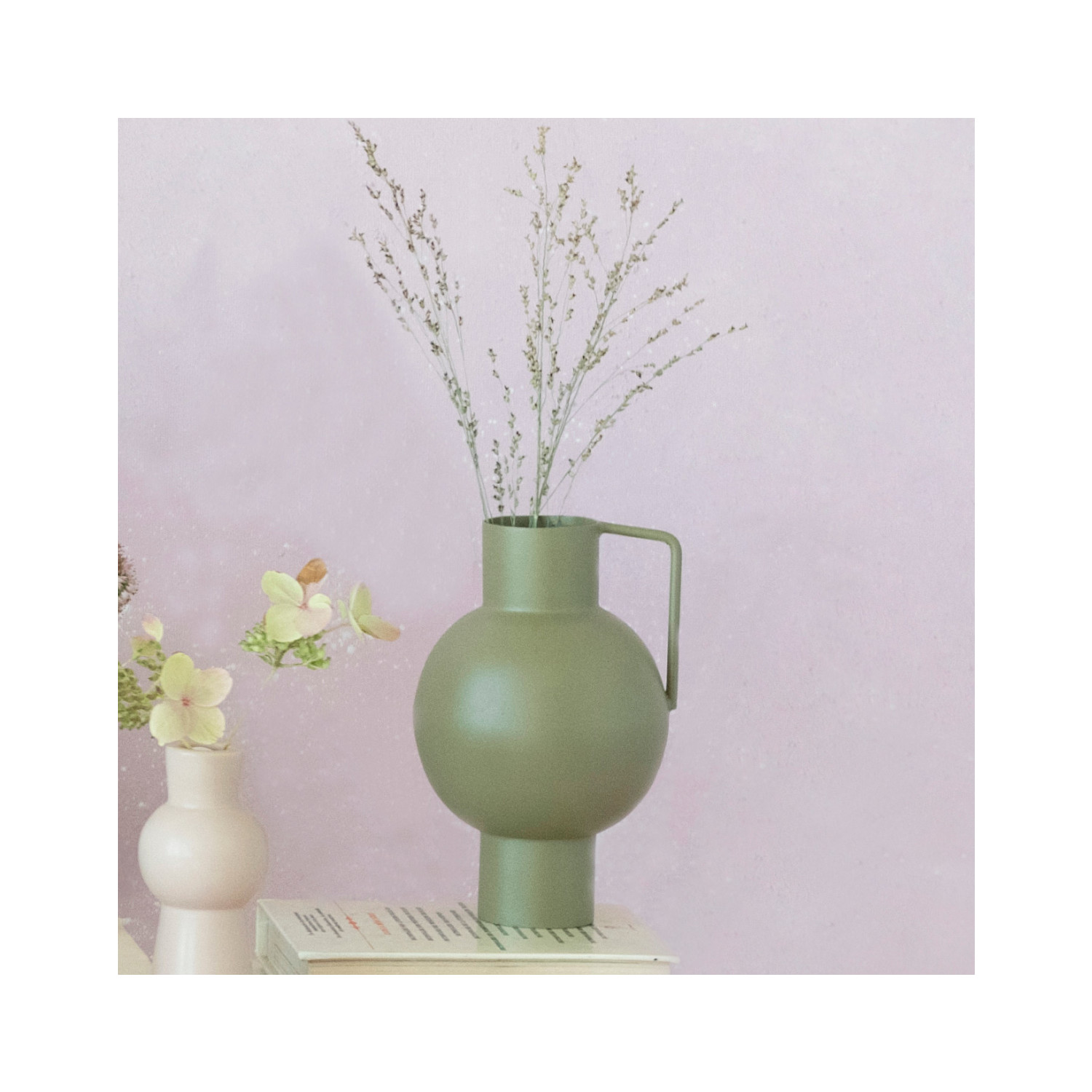 This contemporary twist on a classically designed vase showcases a textured metal silhouette, finished with a stylishly functional handle. Matte celadon textured metal vase with handle. Display this stylishly versatile vase as a sophisticated mantel accent or part of an inviting dining table centerpiece. Made from 100% iron.