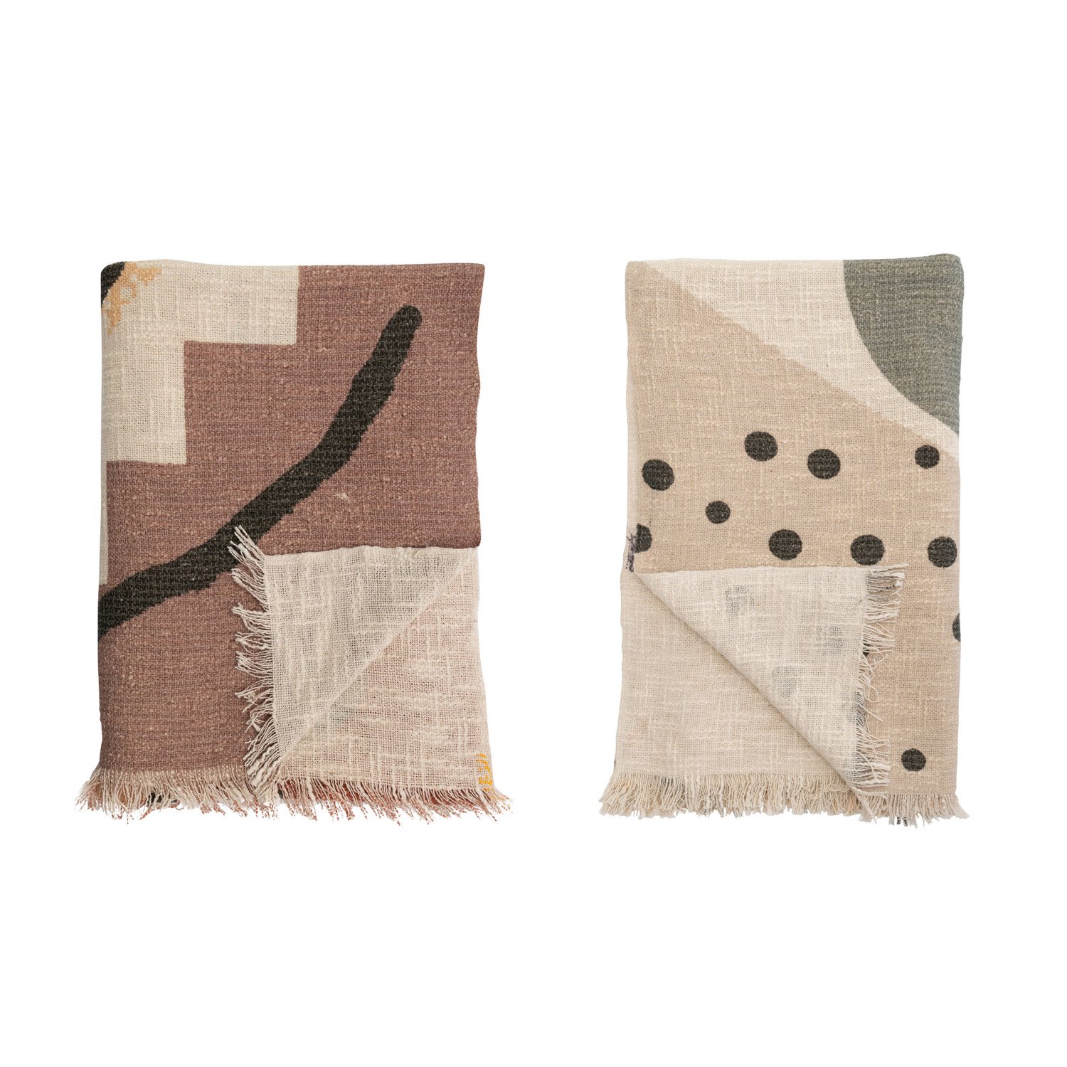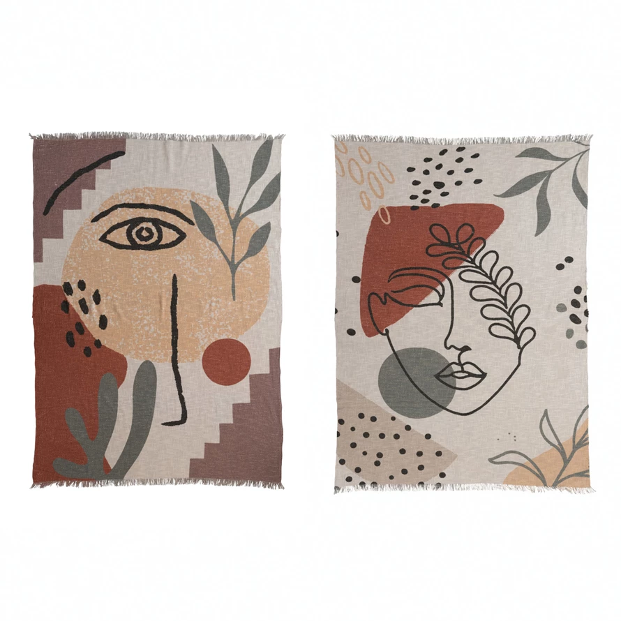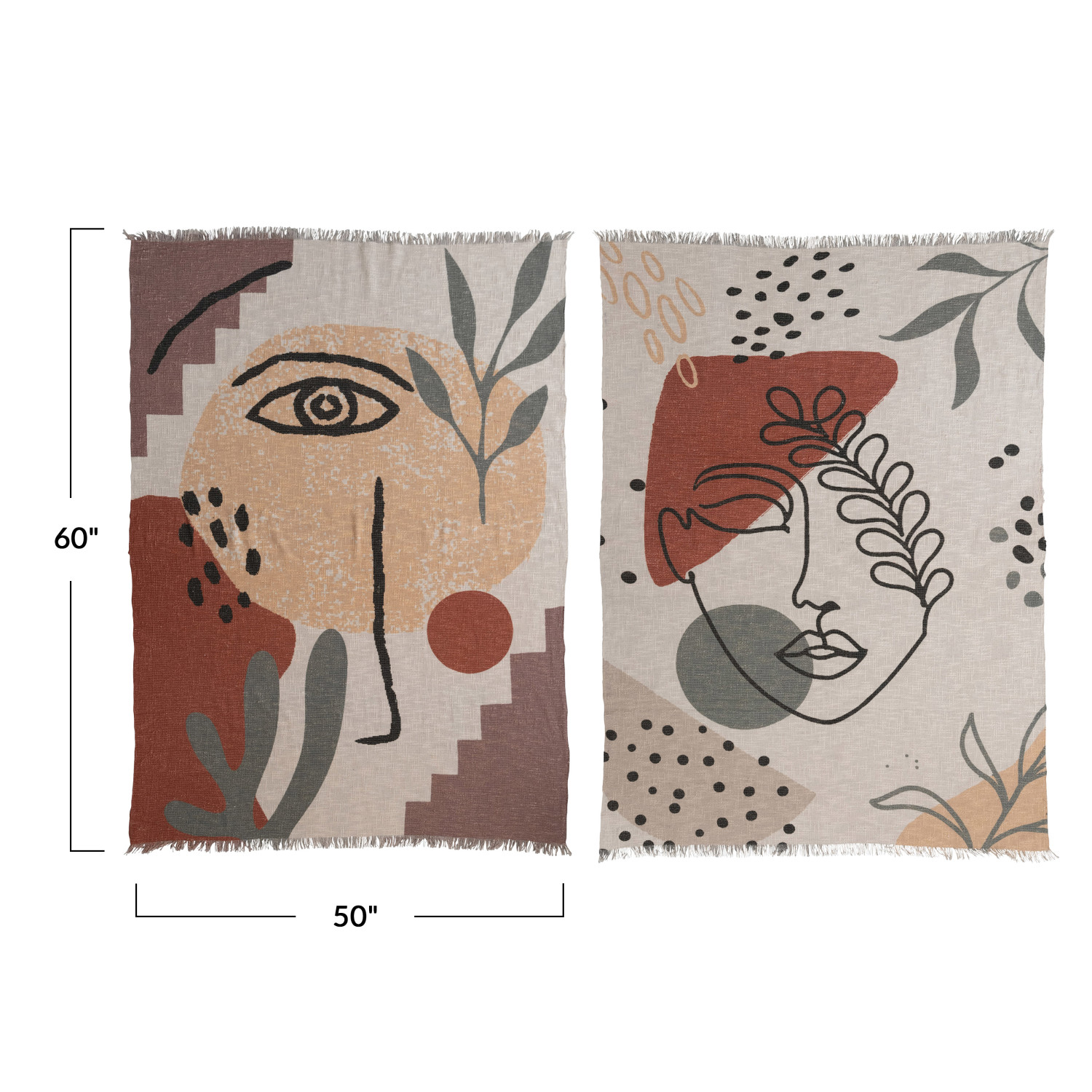 Cotton Printed Throw w/ Abstract Face, Design & Fringe, 2 Styles
