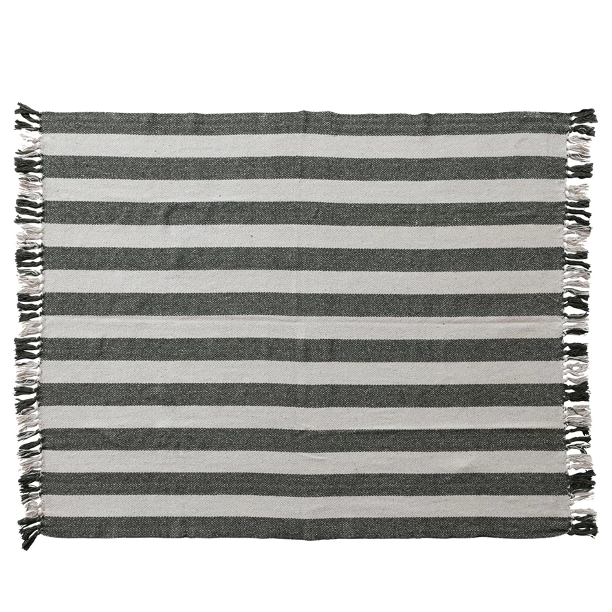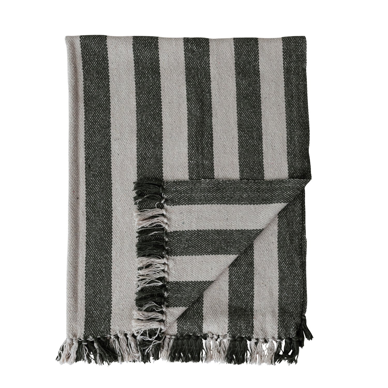 Woven Recycled Cotton Striped Throw with Fringe, Natural & Green