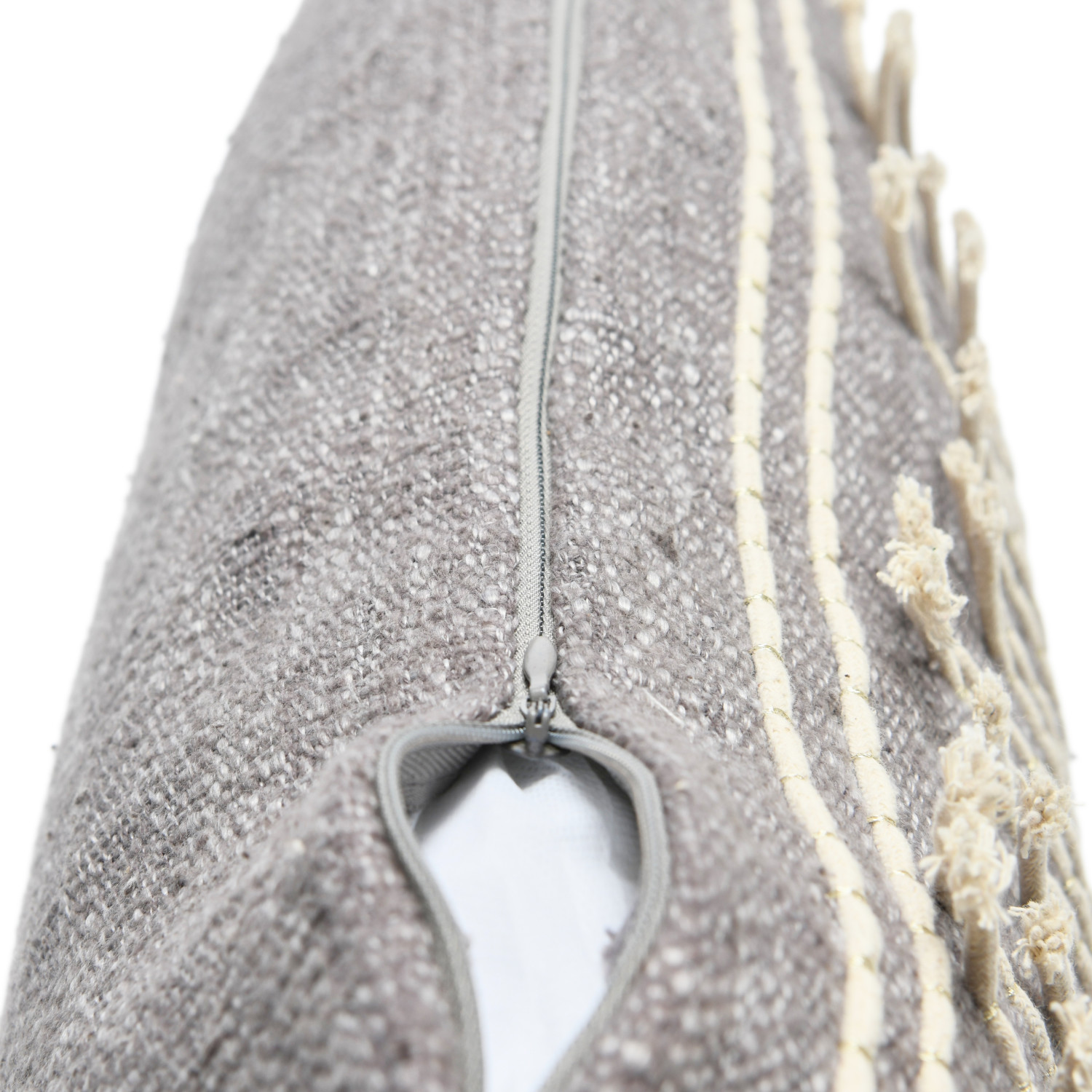 This modern lumbar pillow showcases a durable cotton construction with appliqued rope, and intricately embroidered metallic accents. Dark grey and natural cotton lumbar pillow with white appliqued rope and metallic thread detail; Dark grey cotton encasement on back. Express your constantly evolving style with the simple addition of this eye-catching pillow. Removable cotton lumbar pillow cover and insert; Hidden in seam zipper closure; Hand wash, do not bleach, do not tumble dry, medium iron from reverse.