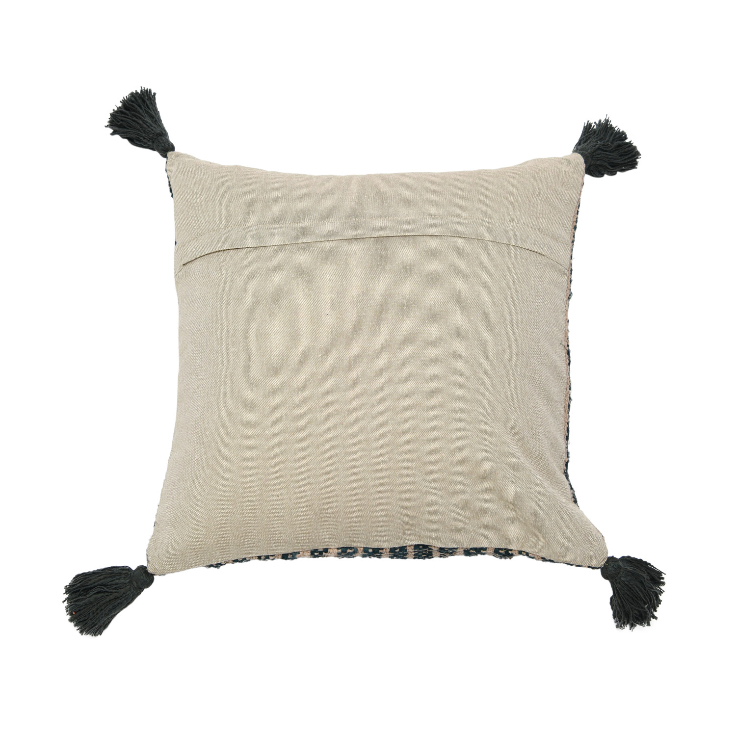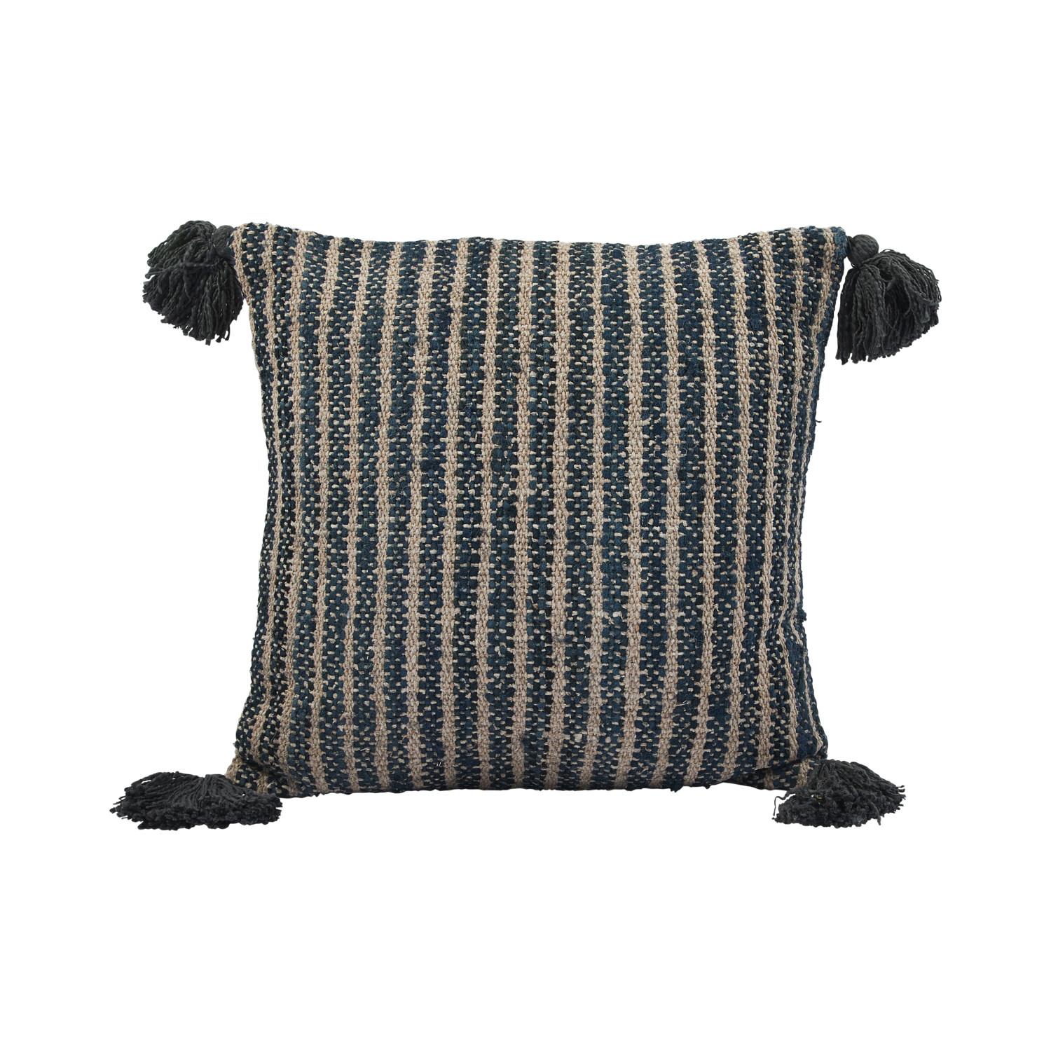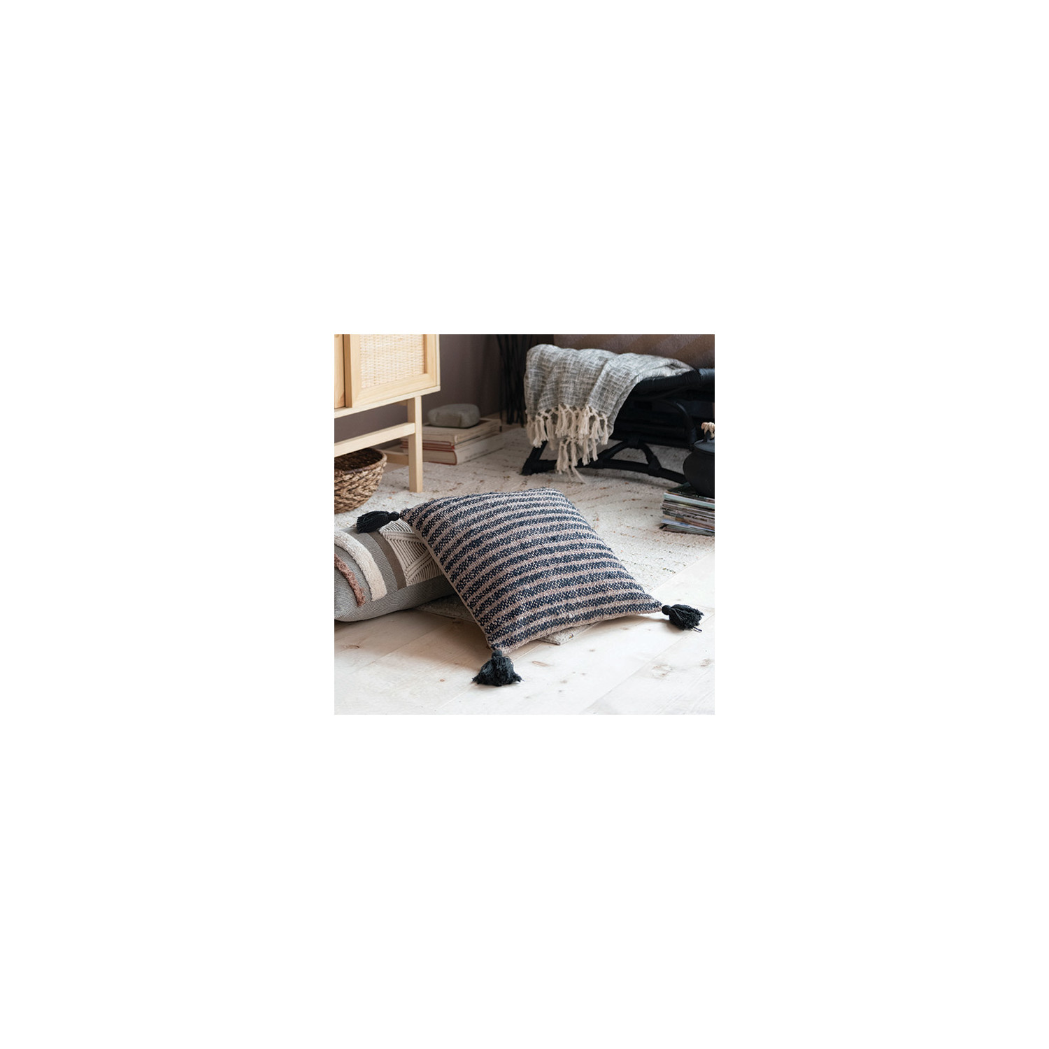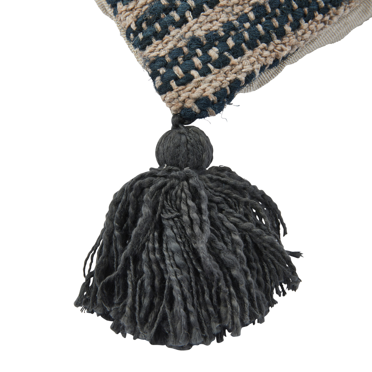 This rustic throw pillow cover features textural woven cotton construction with stripes and decorative tassels. Black and tan woven cotton throw pillow with stripes and tassels; Natural cotton encasement on back. Express your constantly evolving style with the simple addition of this eye-catching pillow. Removable cotton throw pillow cover with polyester insert; Back zipper with hidden flap; Spot clean only.