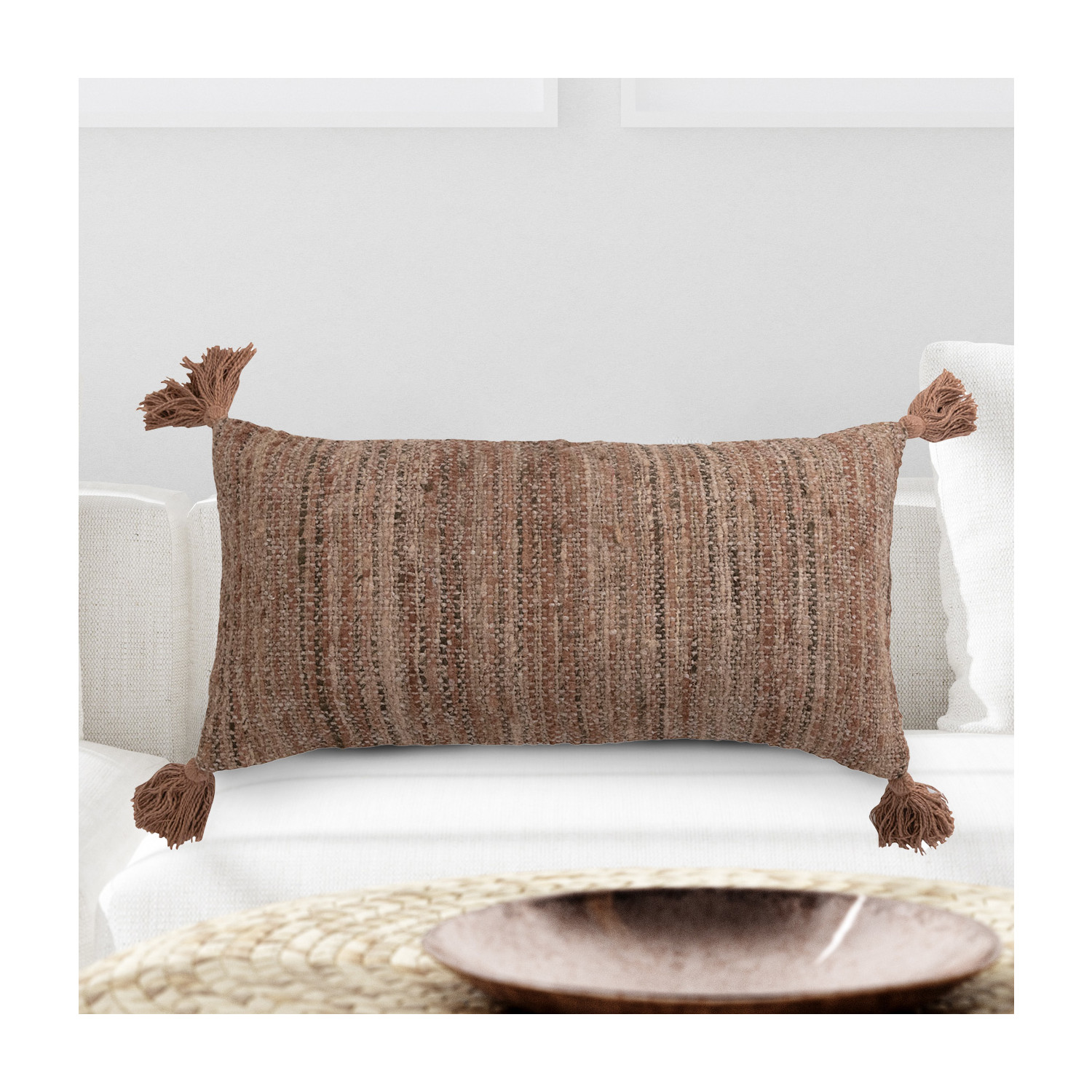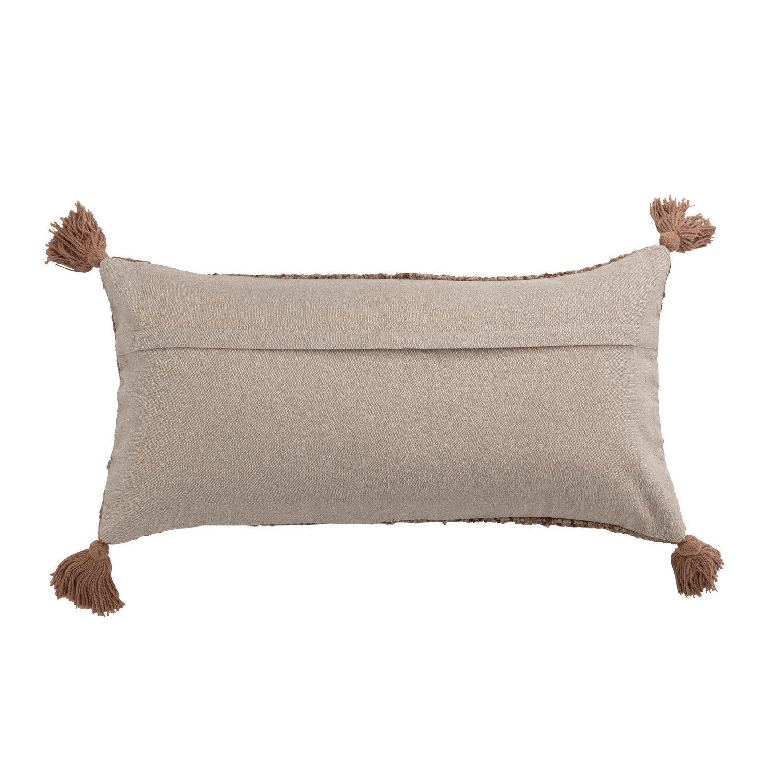 This rustic lumbar pillow features durable cotton construction with intricately woven stripes, finished with decorative tassels. Square woven cotton lumbar pillow with embroidered stripes and tassels; Natural chambray encasement on back. Express your constantly evolving style with the simple addition of this eye-catching pillow. Removable cotton lumber pillow cover and insert; Back zipper with hidden flap; Spot clean only.