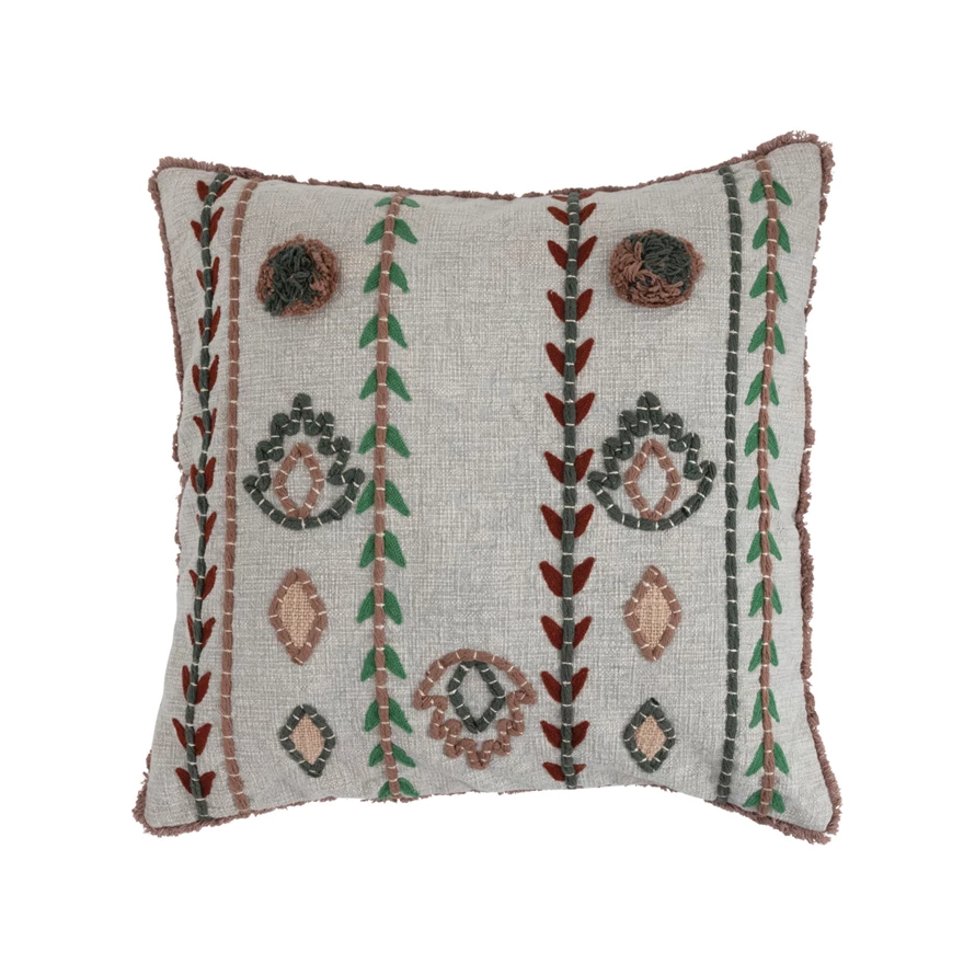 Catalog Name: 20" Square Cotton Pillow w/ Embroidery, Chambray Back & Fringe, Multi Color
