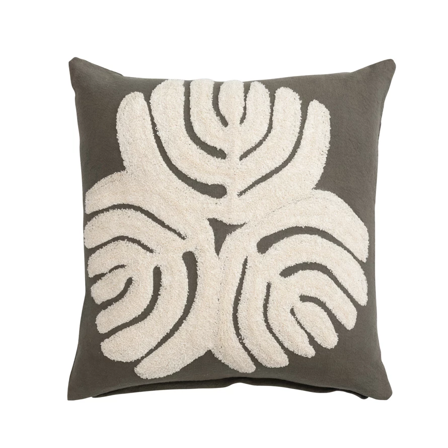Catalog Name: 20" Square Cotton Slub Pillow w/ Embroidery & Abstract Design, Olive Green & Cream Color